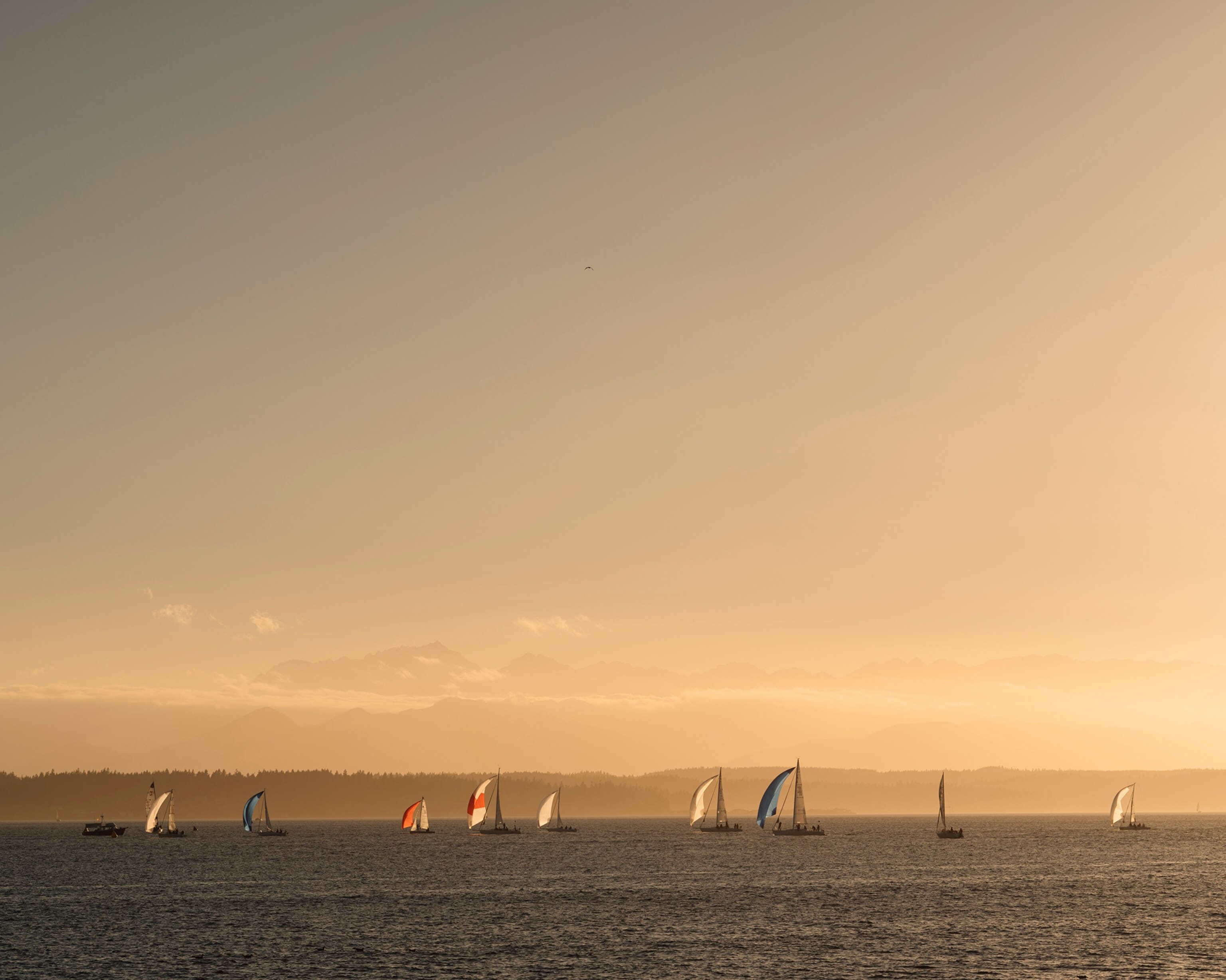 The hazy outline of the Olympic Mountains looms over a cluster of sailboats.