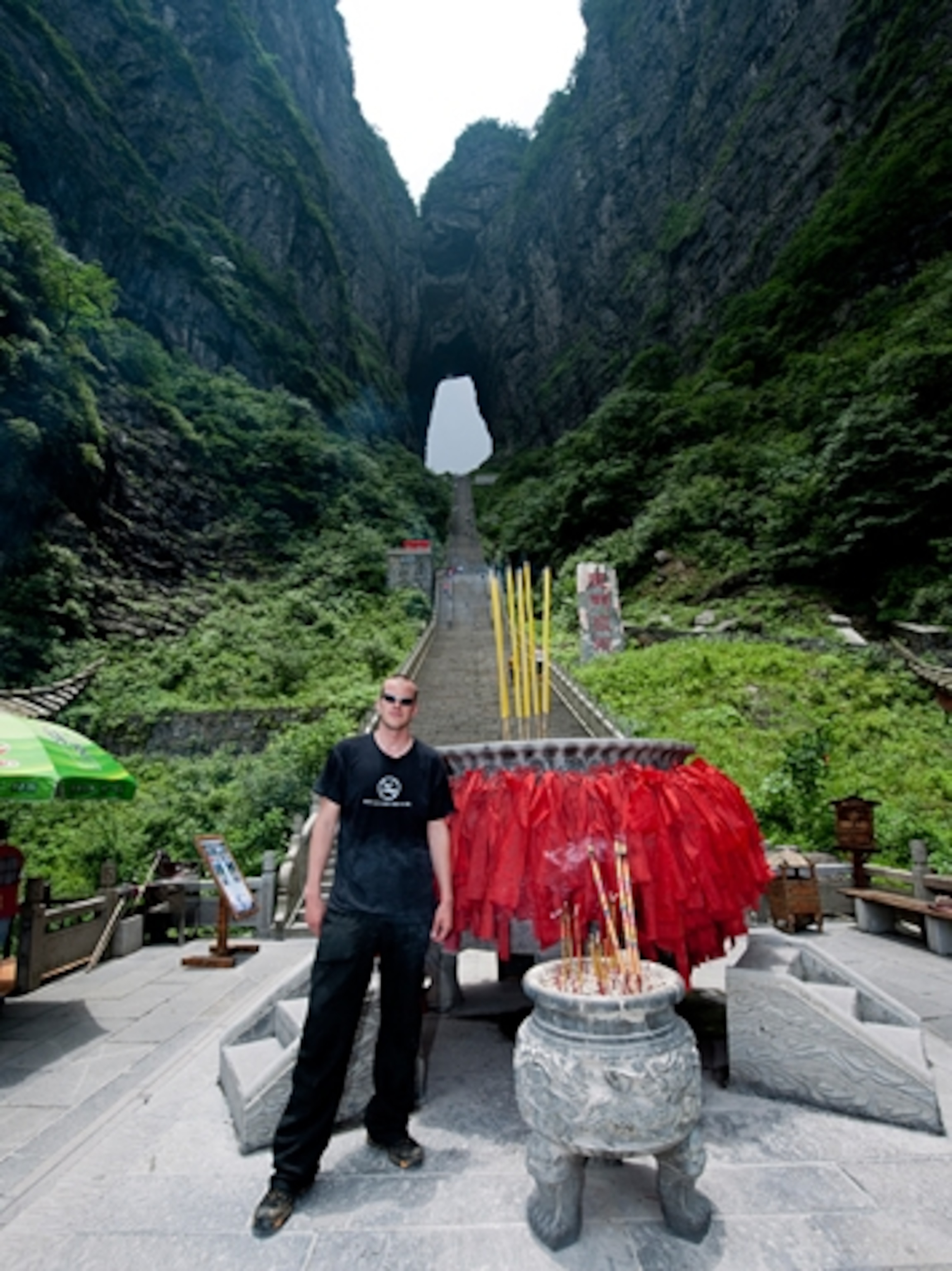 On Saturday (which works out to be 1 am EST on Friday) Jeb will jump from a helicopter hovering at around 6,000 feet and fly through a cave located on top of Tianmen Mountain in the Hunan Province, China (photo above). He will continue his flight through a narrow gorge over staircases covered with spectators for about a mile until he can finally open his parachute.