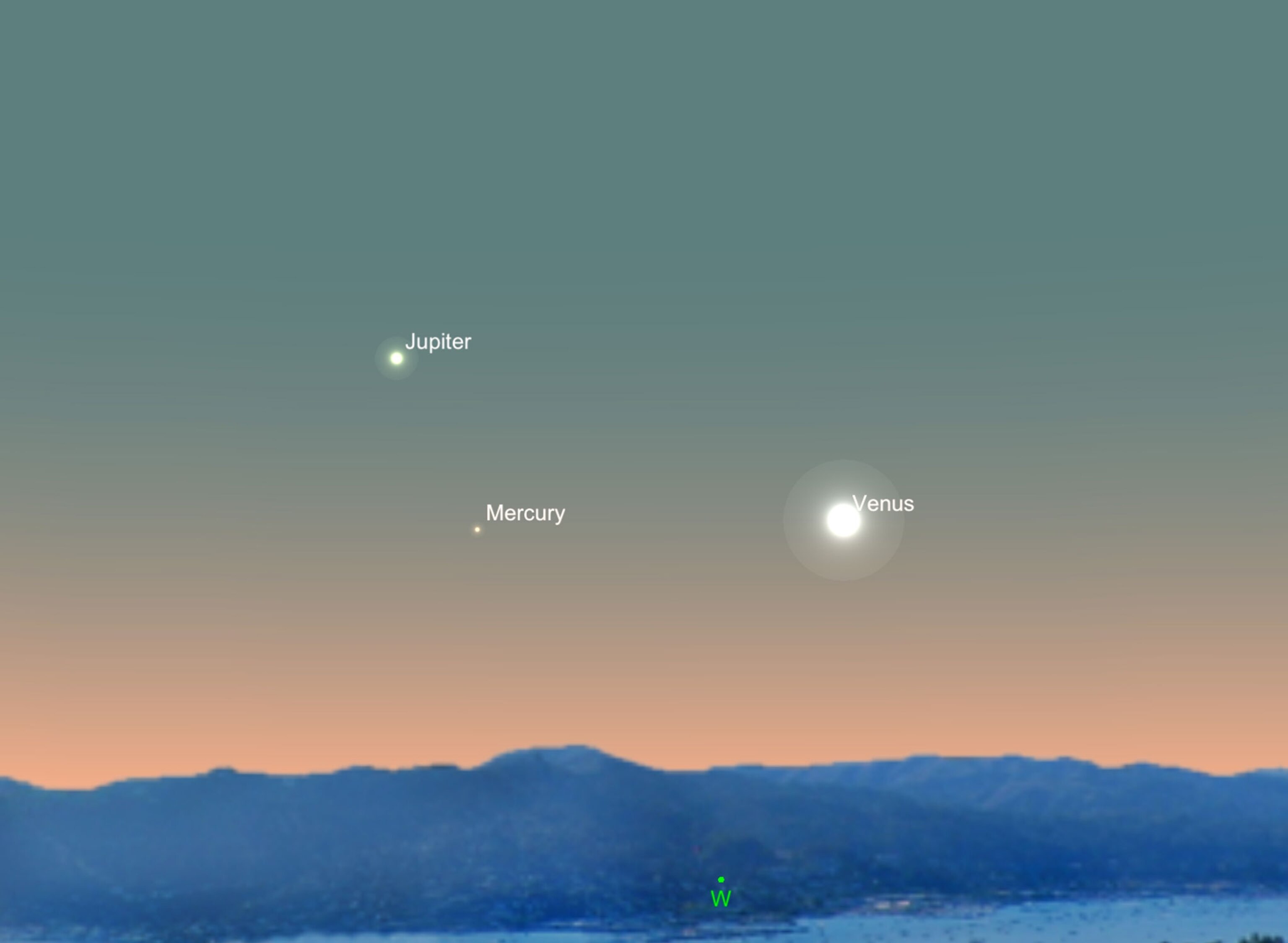 To find Mercury, start by using binoculars to look for the faint, starlike world about a half hour after sunset. It will be only five degrees above the western horizon, equal to the width of your three middle fingers held at arm’s length. Jupiter will help you out in your planetary hunt, as the bright planet will be just above Mercury, about half a binocular field of view away. Remember that Mercury will be following the sun and will set very quickly, so timing your viewing will be critical.