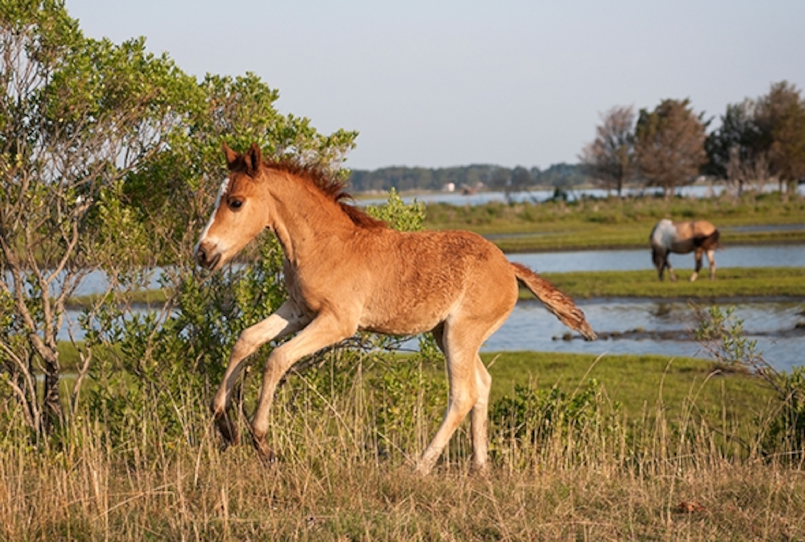 Cyclists and pedestrians traveling along the three-mile Wildlife Loop that girds Snow Goose Pool will observe snowy egrets and green and tricolored herons. The nearby (and bike-friendly) 1.6-mile Woodland Trail weaves through loblolly pine forests, where a rebounding population of Delmarva fox squirrels frolic, to an elevated overlook that affords the occasional pony sighting.