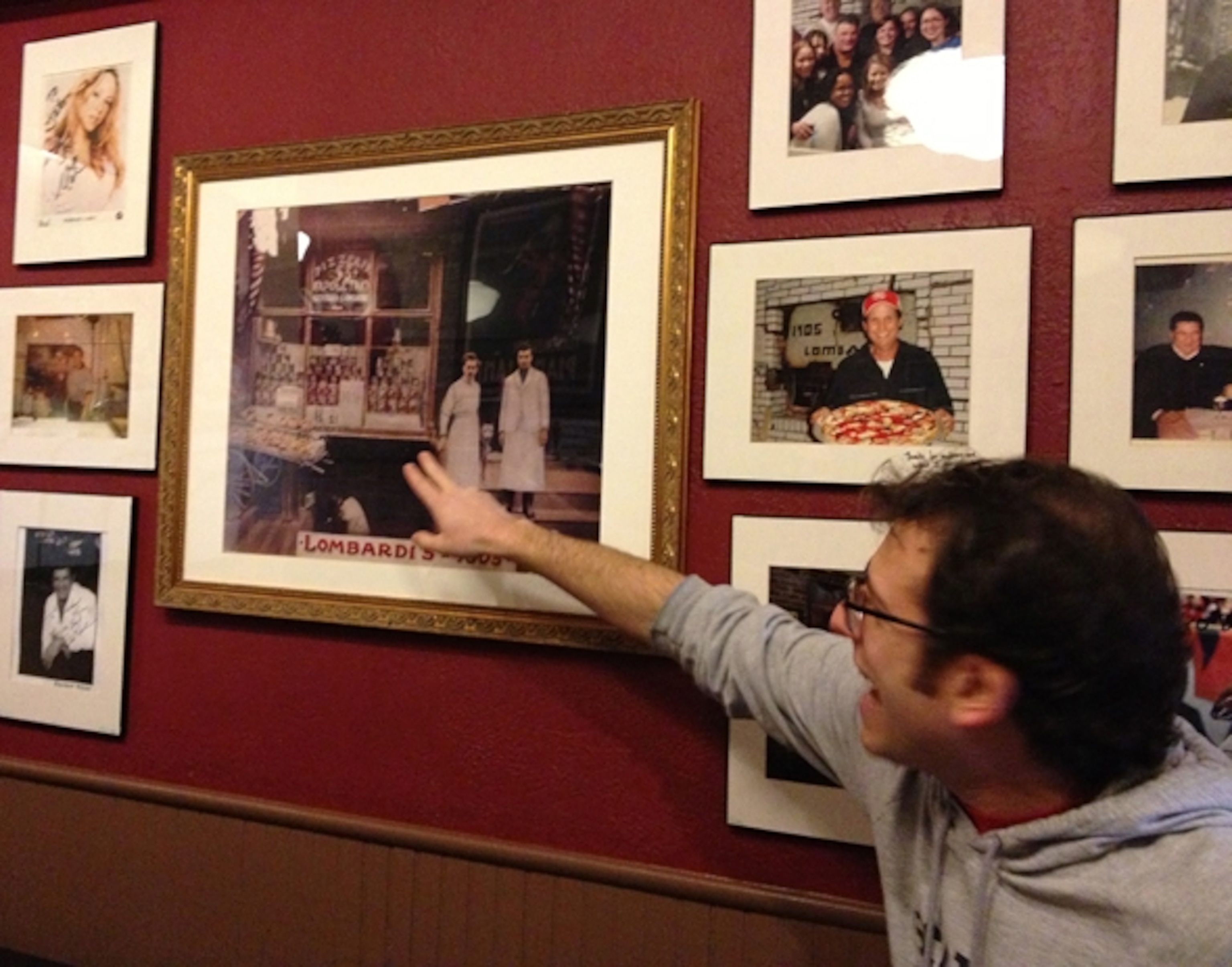 Appropriately, the tour started at the first pizza place in America. After we’d all filed inside, Scott drew our attention to a picture of the first owner, Gennaro Lombardi, with Anthony “Totonno” Pero (Lombardi’s employee who went on to found the storied Totonno’s on Coney Island) and began telling us the story of how American pizza was invented. Scott shared the nuances of how the fornaios or “stick men” move around as many as a dozen pies at a time, using a roughly 13-foot peel in an oven that reaches temperatures over 1,000° Fahrenheit. (Scott knows this because he’s always packing a thermometer gun.)