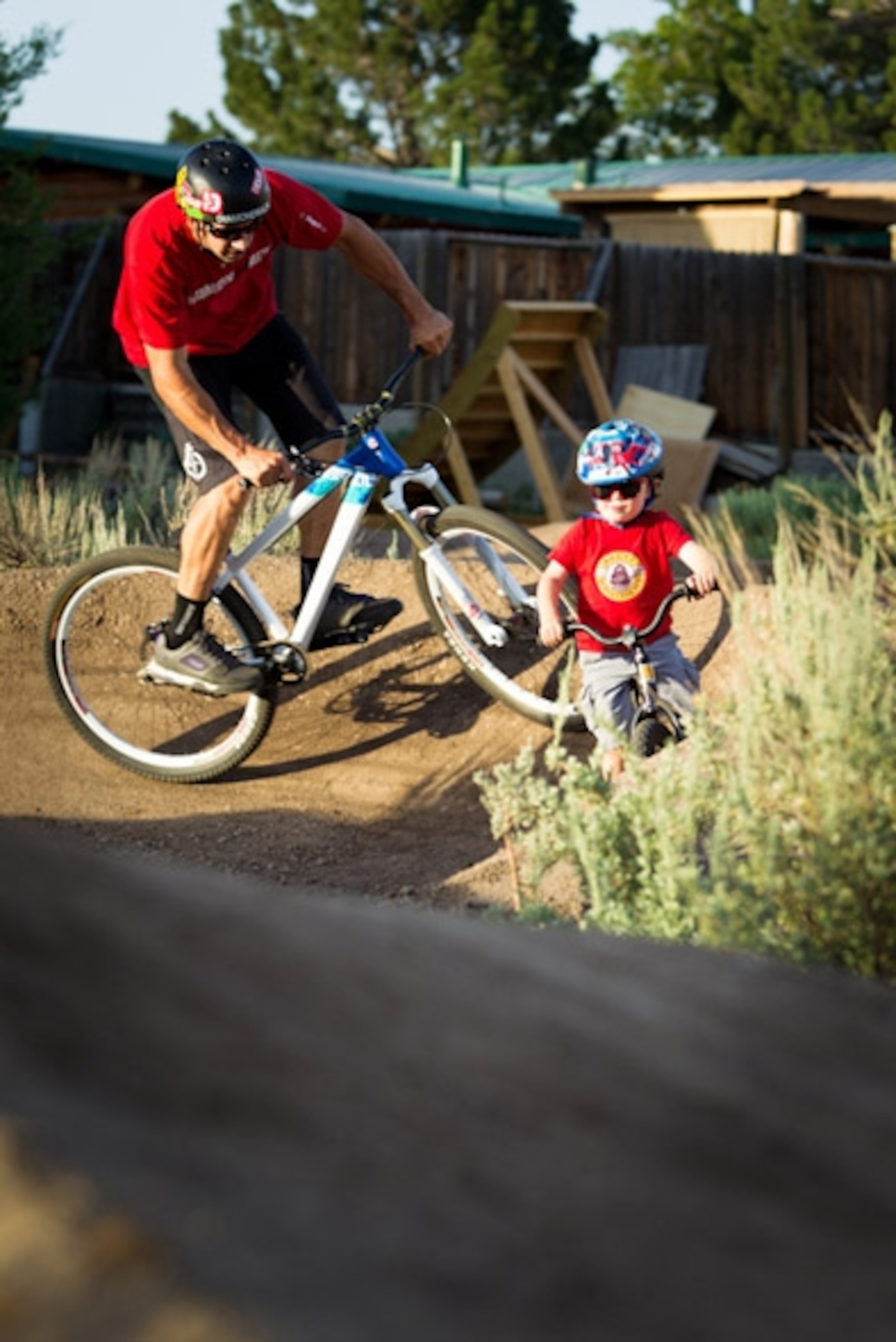 Eric has transformed his little slice of heaven into a mountain biking playground that can be replicated anywhere you’ve got a 40 x 20 foot plot of flat ground, no mountains required. By ditching the water-hogging, chemical-dousing insanity of a lawn in favor of the perfectly sculpted berms and rollers of a pump track, Eric not only earns uber fun Dad status, he earns green points with the planet as well. More importantly, he has planted the seed of adventure in the amazing mind of a two-year-old on a pushbike.