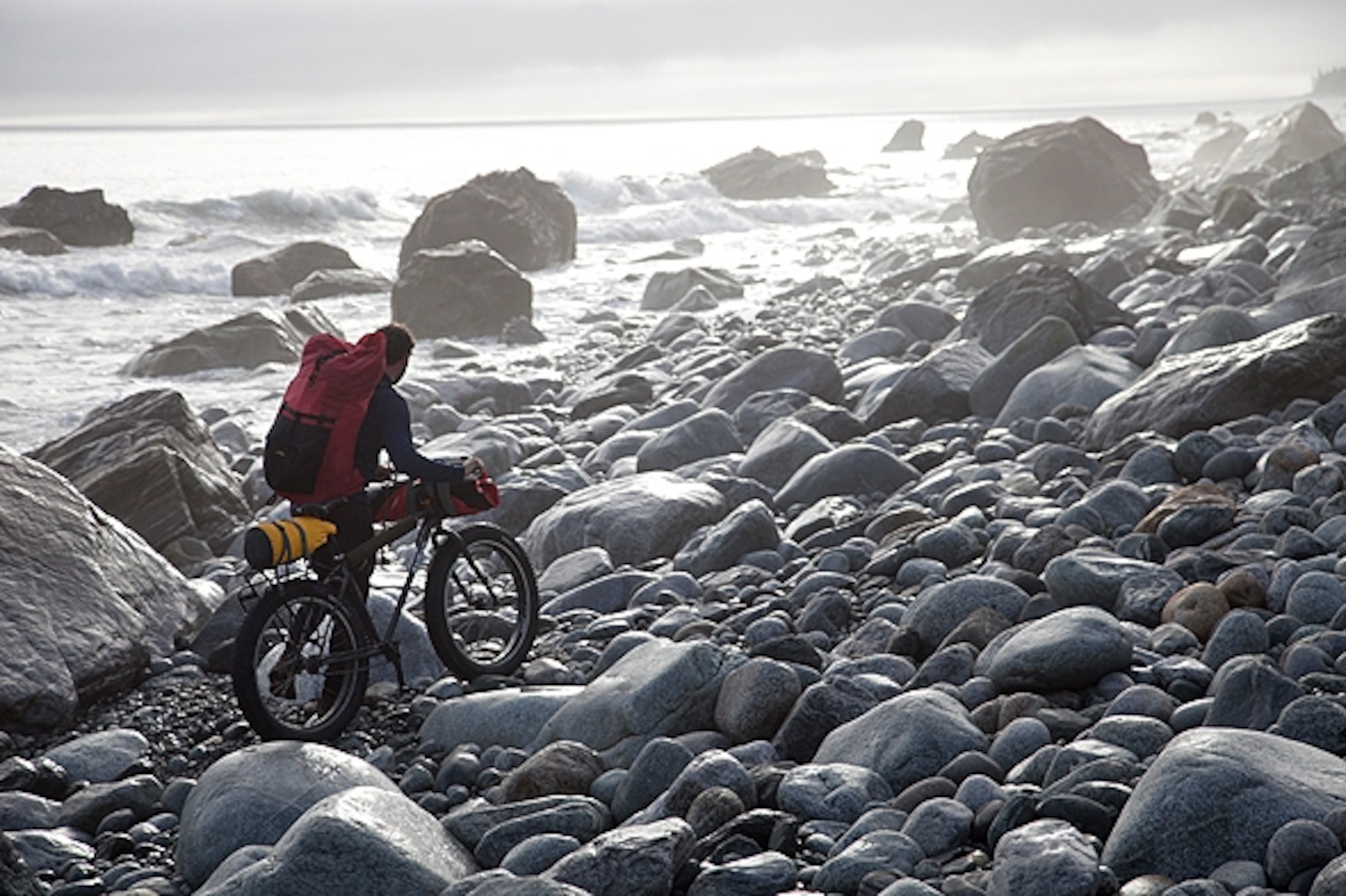 Within a year of watching that inspirational video, I had bought the necessary gear and lassoed a partner for a ride along Alaska’s coast from Yakutat to Cordova. I was instantly converted to this new mode of travel. We’d bounce over beach cobbles the size of grapefruit and blissfully pedal over miles of black sand. If we had to cross one of the many glacial-fed rivers or wide bays, we’d move into a more amphibious mode of travel by using our Alpacka rafts. Between using our bikes and rafts, I felt like there wasn’t much terrain that would stop our progress.
