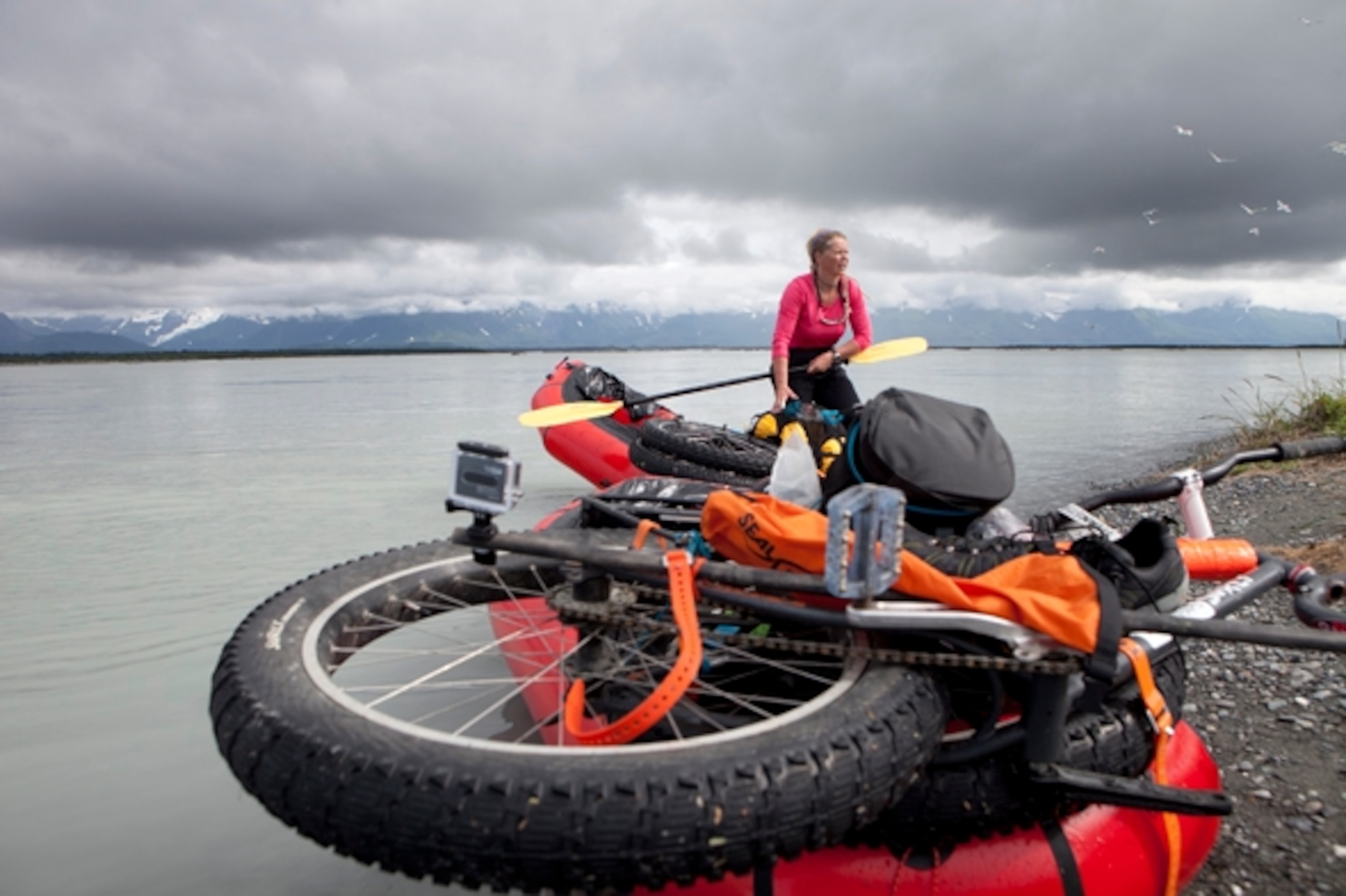 With our bikes strapped tightly to the bow, we wedge ourselves into puny Alpacka rafts, and get ready to cross the mighty Alsek, an enormous river that empties into Dry Bay at an average flow of 80,000 cubic feet per minute. Before shoving off, we take a few minutes to watch chiseled icebergs the size of pool tables and huge, uprooted spruce trees bob up and down in the churning grey current as they quickly float past us toward the Pacific. I look over at Iris to gauge her comfort level. “You ready for this?” Normally talkative, Iris is quiet but finally says, “Yep! Let’s go!”