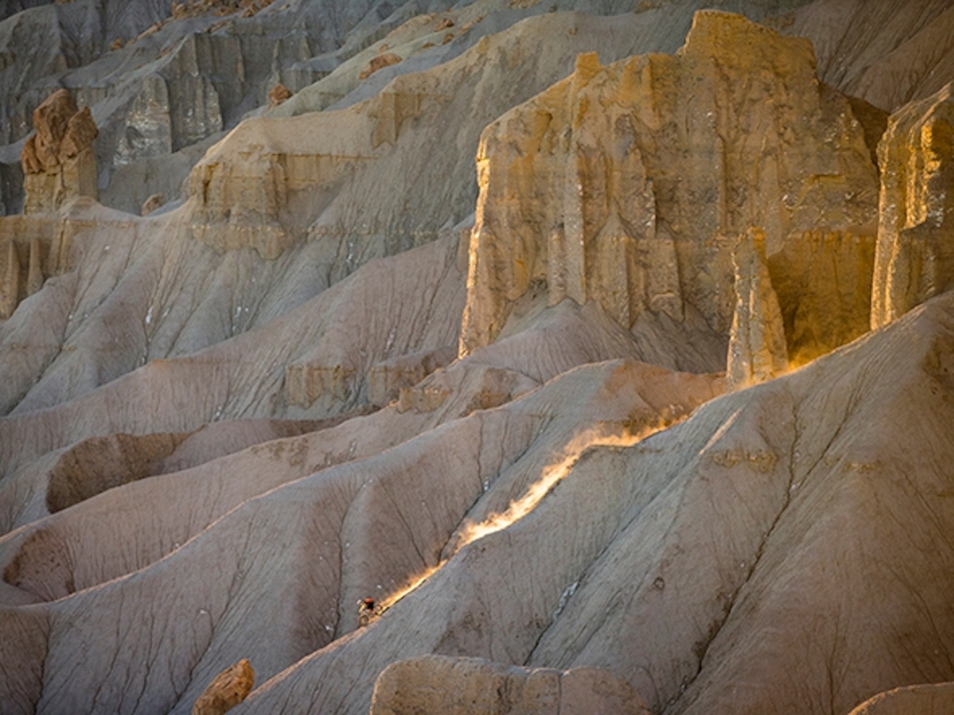 CP: The great thing about the mountain biking here is the amount of freedom you have. There are no trails, and the lack of vegetation makes almost everything a rideable surface, so you are really only limited by your imagination and your comfort level with the terrain. There is a large enough area to explore that you could spend years riding here without ever getting bored and seldom riding the same line. The terrain is very complex, with lots of folds, spines, and rolls to explore and play on, and there is enough variety that you can really bite off as much as want to chew as far as difficulty and exposure are concerned. It has the full spectrum of riding options from super mellow to outright death-defying, and everything in between. In essence, it looks and feels like backcountry skiing, but without the risk of avalanches and you’re on a bike instead of skis.