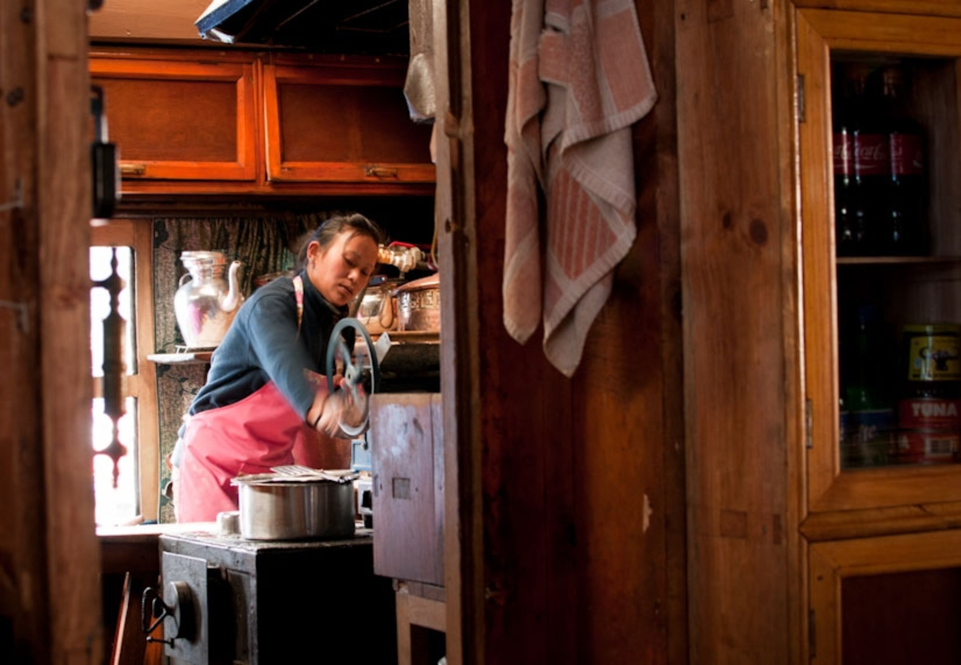 Life for the people here is a vibrant one, though, and they appreciate its perks just as much as anywhere else in the world. As I sit with Sherab at the local momo shop for lunch of a steamed dumpling filled with meat and vegetables (the best in the Khumbu he says), we discuss the local workings of the town and the region. We talk about the local power plant across the valley in Thamo, which provides electricity to the area. The plant was donated by the Austrian government, in the early 90s and provided the first electricity to the region. It began the onset of technological advancement in the region. Nowadays, most every Sherpa, young and old, has a cell phone, and amenities such as electric washers and driers and big-screen TVs are found in some of the lodges and homes. The Khumbu has become part of the globalized world … so it would seem.