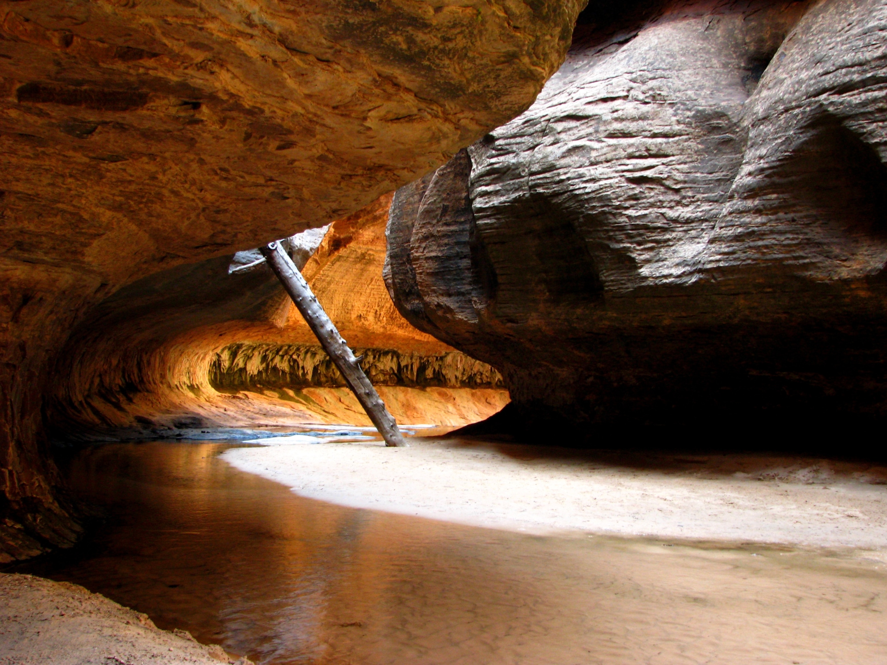 A few technical obstacles require a rope between Russell Gulch and the Subway proper, along with a swim or two depending on current water levels. Keyhole falls, a short but scenic drop, mark the beginning of the Subway proper as the walls begin to violently rise far above you, and its trademark namesake begins to take shape. Though the Subway itself is only a few hundred meters long, it is one of the most impressive formations to be found within the boundaries of Zion. We walk slower and slower and ultimately come to a halt as I lay on a small beach, digging my fingers into the wet sand. We sit together for a moment. She silently looks at me. I gaze endlessly back. No words needed.