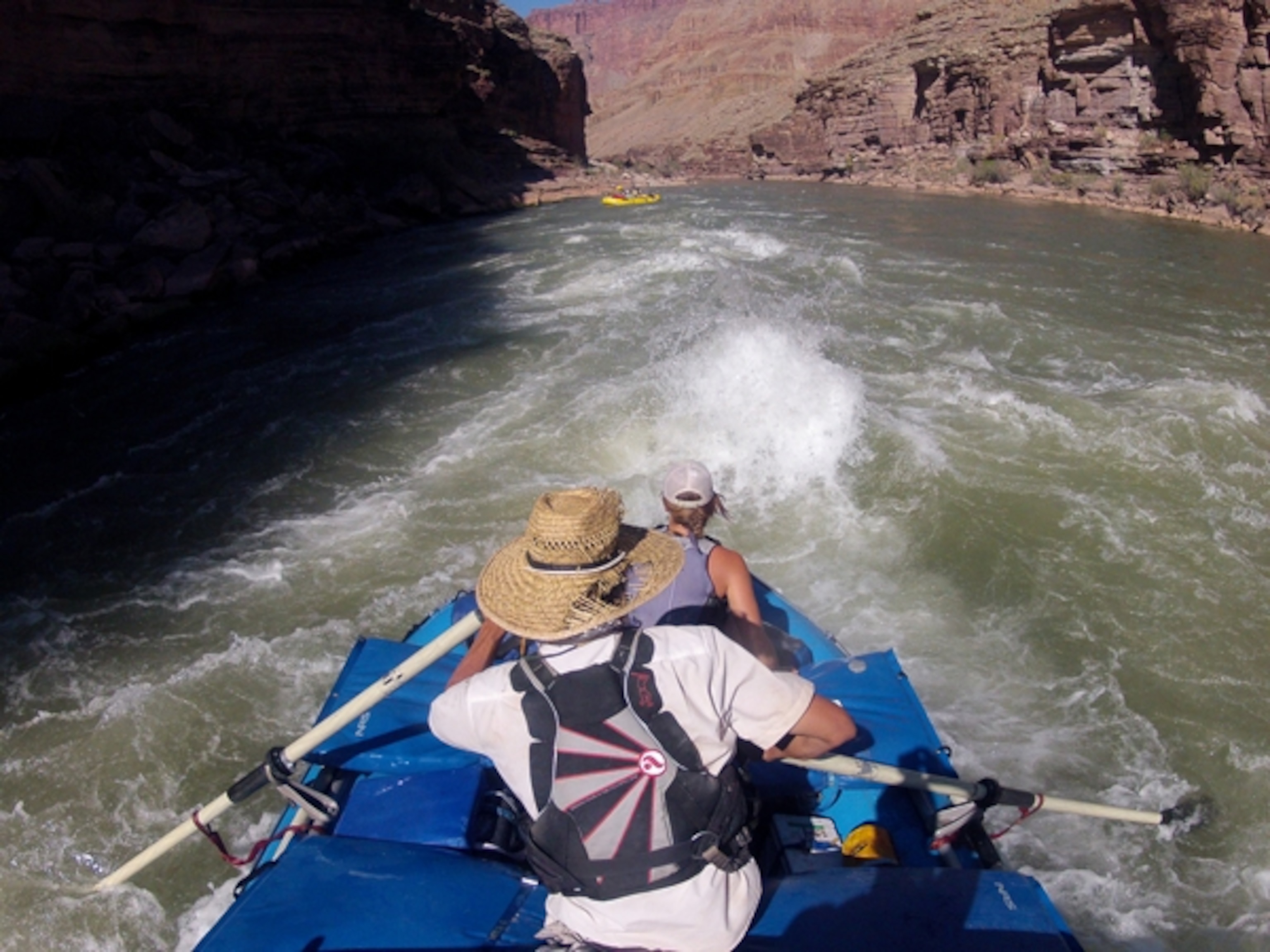 Keep it straight and square up for the big hits! Often times, piloting a fully loaded, monstrous raft through Grand Canyon whitewater is as simple as that. Our craft are far from hot rods—they measure in at 16 or 18 feet long, are fully loaded, and are powered by a single oarsman. To make it unscathed, lines through the crashing waves and boiling eddies must be chosen carefully to allow as much margin for error as possible. And when you find yourself mid-rapid, pushed in the wrong direction, and headed directly for a notorious raft-flipping hydraulic? Square up and hope for the best!