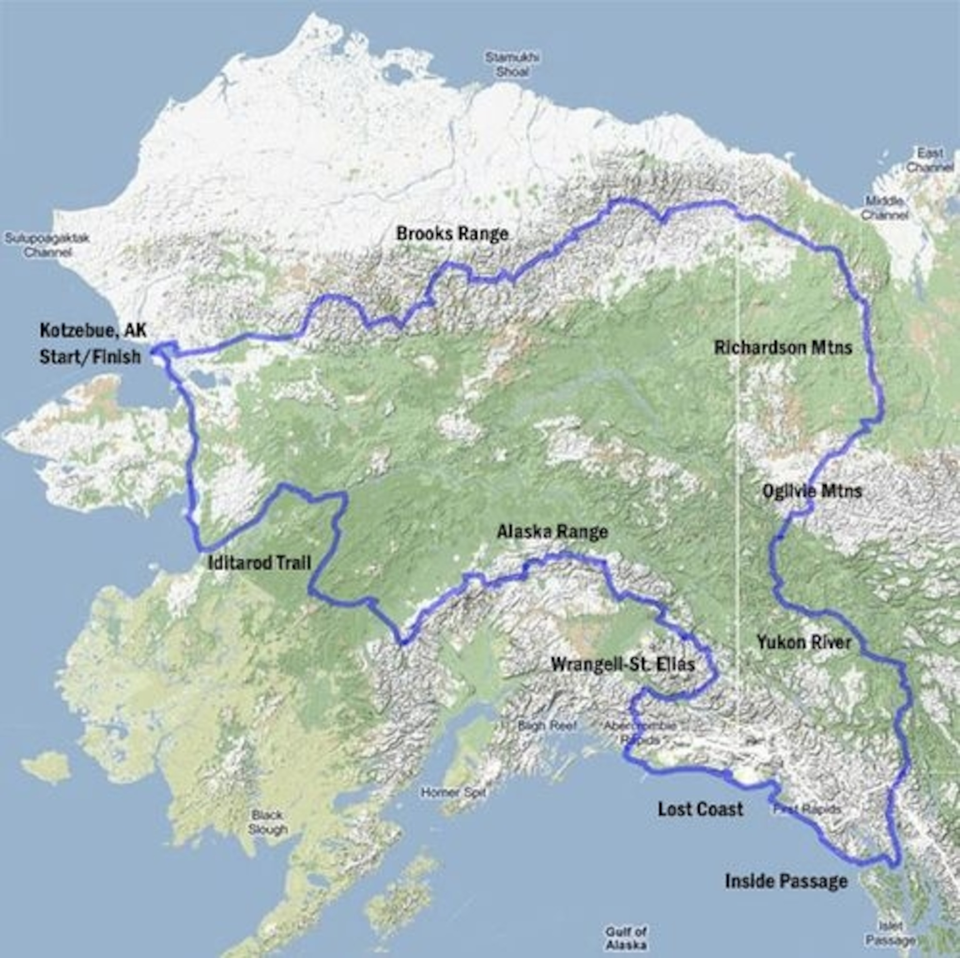 Andrew's route inspires both awe and envy. He will cross through six U.S. national parks (Denali, Wrangell-St. Elias, Glacier Bay, Gates of the Arctic, Klondike Gold Rush, Kobuk Valley) and two Canadian national parks (Vuntut and Ivvavik). He will traverse parts of the Arctic National Wildlife Refuge, the Iditarod Trail, and the Chillkoot Trail. He'll also float some of North America's wildest rivers—the Copper, Yukon, Peel, and Kobuk. He will hike 450 miles in the Alaska Range and a whopping 975 miles in the Brooks Range.