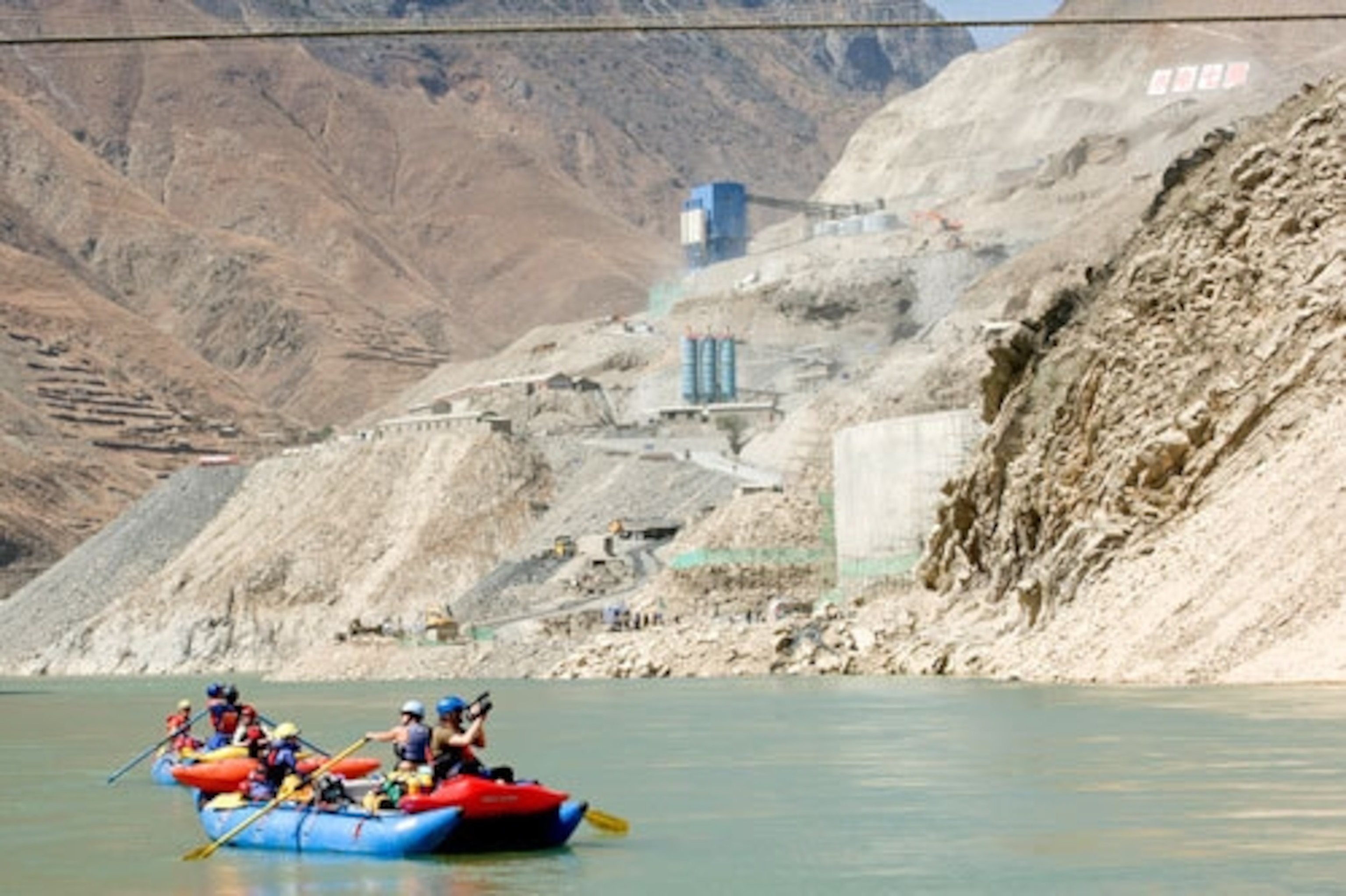 Below Bao Shan, we paddled through more stunning scenery to the Ahai dam site. We moved from a pastoral landscape of goat herders and terraced wheat fields to a dust-filled canyon echoing with the sounds of 10,000 workers and a concrete factory.