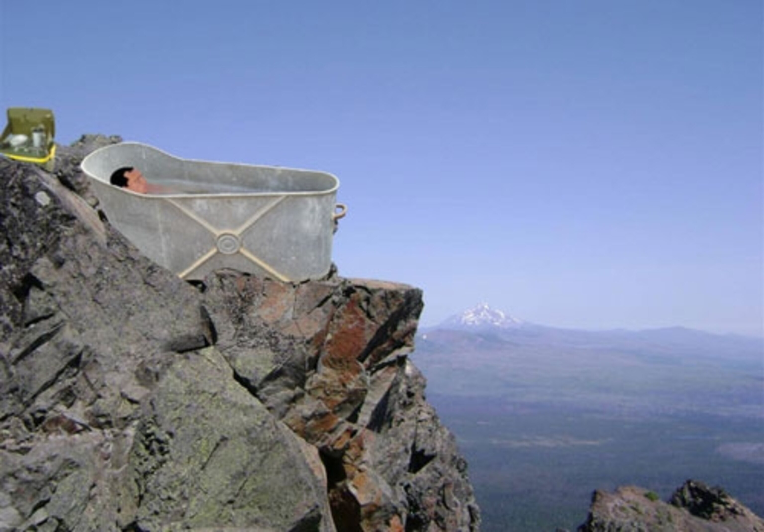 Started out of necessity in the wilds of Alaska, extreme bathing has taken on a life of its own in particularly outdoorsy (and hygienic) communities across the nation, and even the world—there is a devoted Extreme Bathing Club in Saskatchewan, we hear. The goal, as stated by the Society of Extreme Bathers, is "to bathe in as precarious and picturesque a spot as possible." One Charles A. Wipple, of Valdez, took a bath atop the now exploded Mt. Redoubt only five weeks ago, no doubt solidifying his place among the handful of legendary Extreme Bathers. Mr. Wipple, we salute you.