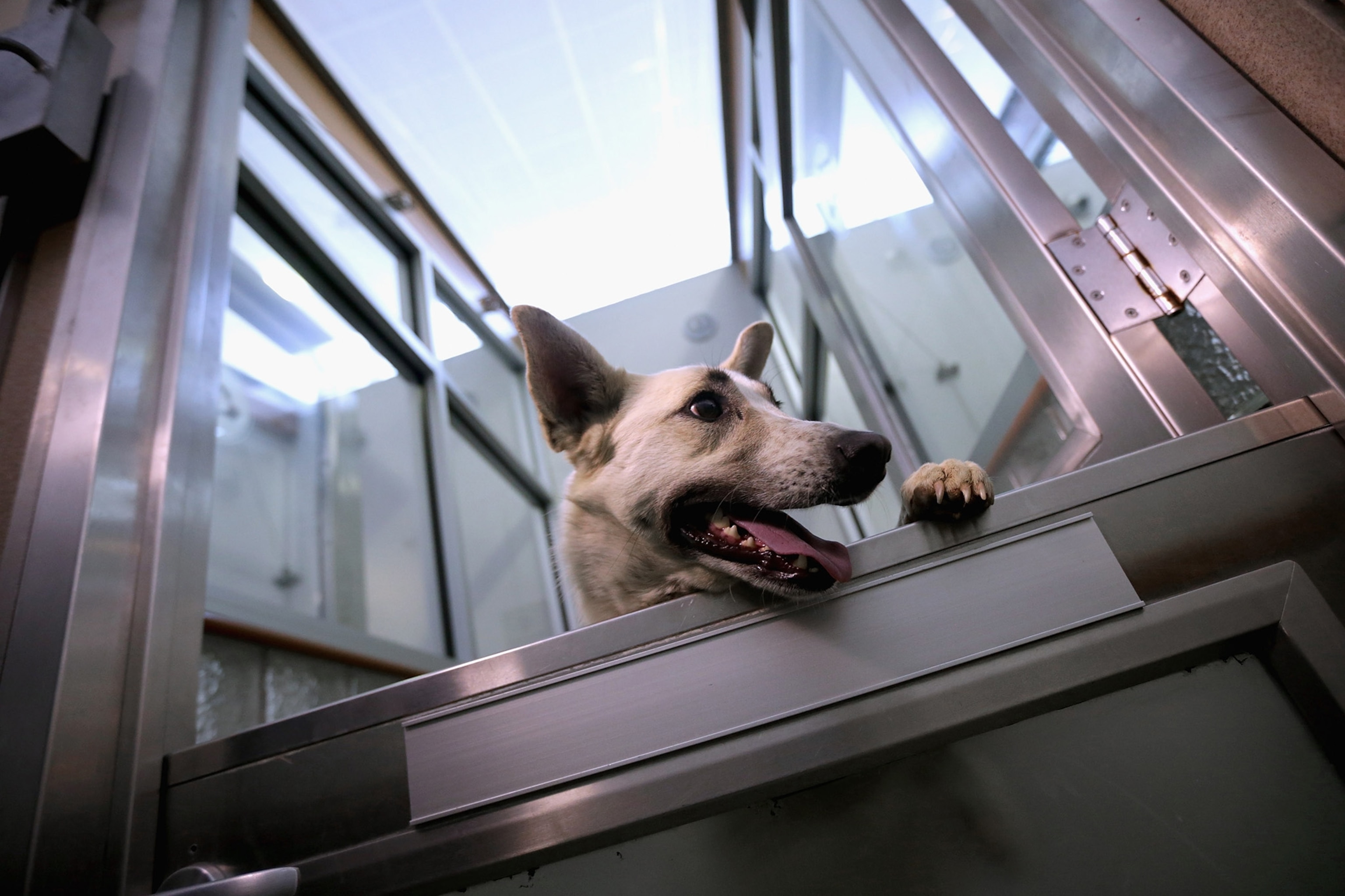 Greeted by a throng of reporters at the animal league Thursday, all of the mixed-breed dogs appeared calm as they were led into their clean and spacious kennels, where they'll live until they are adopted.