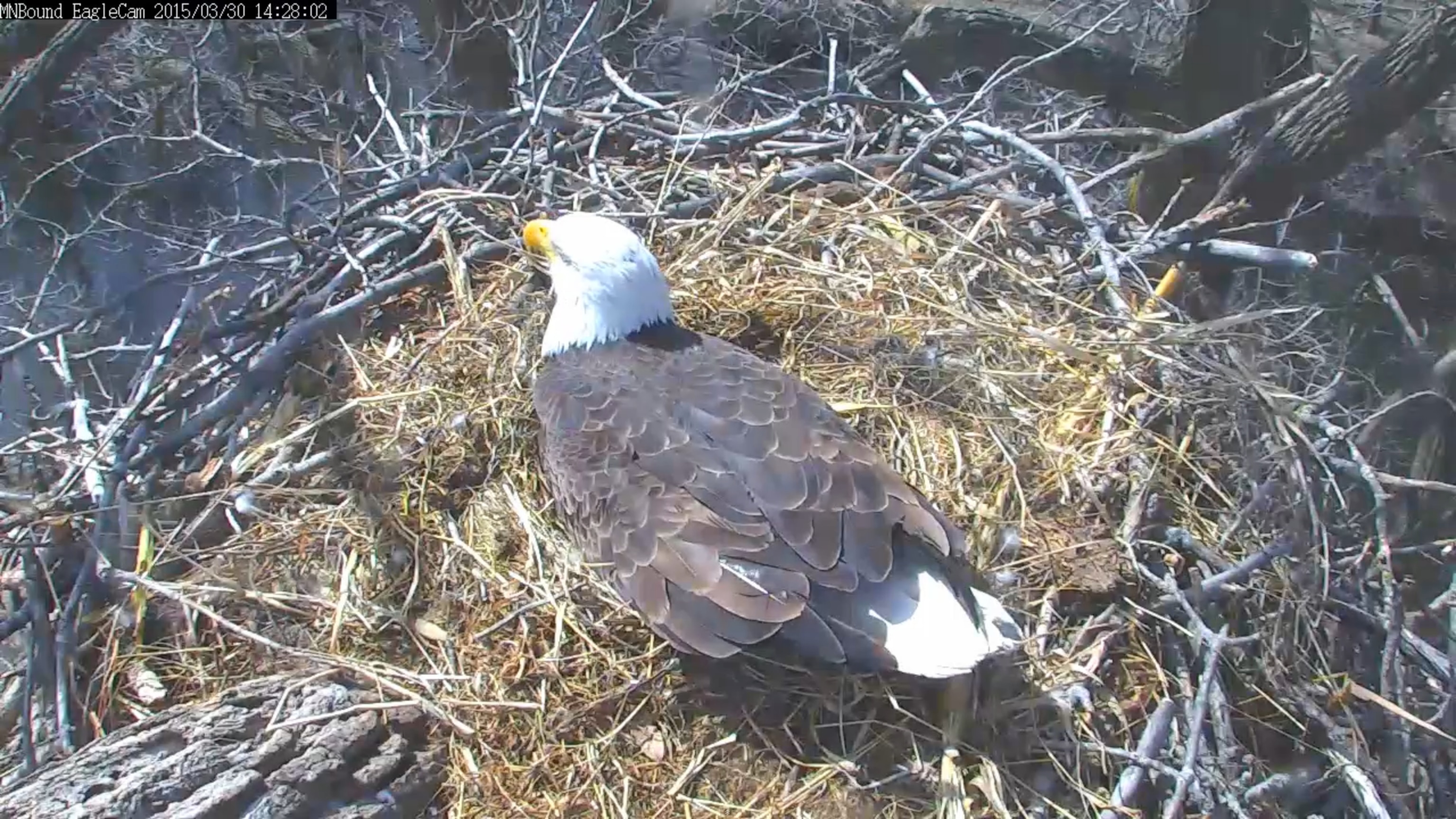 In Minnesota, eaglets from another family have yet to break out of their shells. Northern eagles usually lay their eggs later than southern eagles do; these ones were laid on February 28 and March 3.