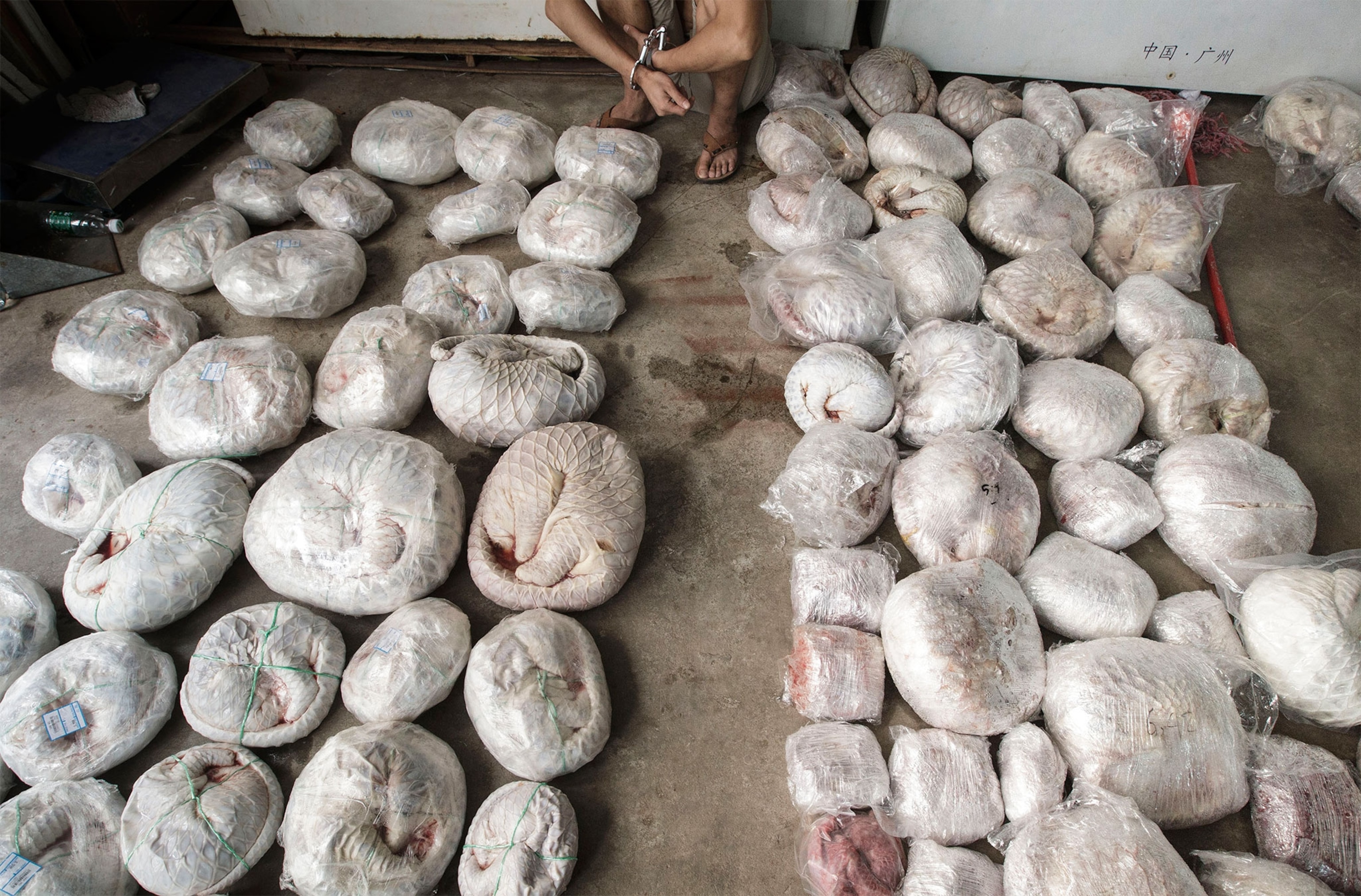 A man in handcuffs crouches next to dead pangolins seized by authorities in Guangzhou, China, in 2014. Pangolins are the world’s most trafficked mammal, over-exploited for their meat and scales.