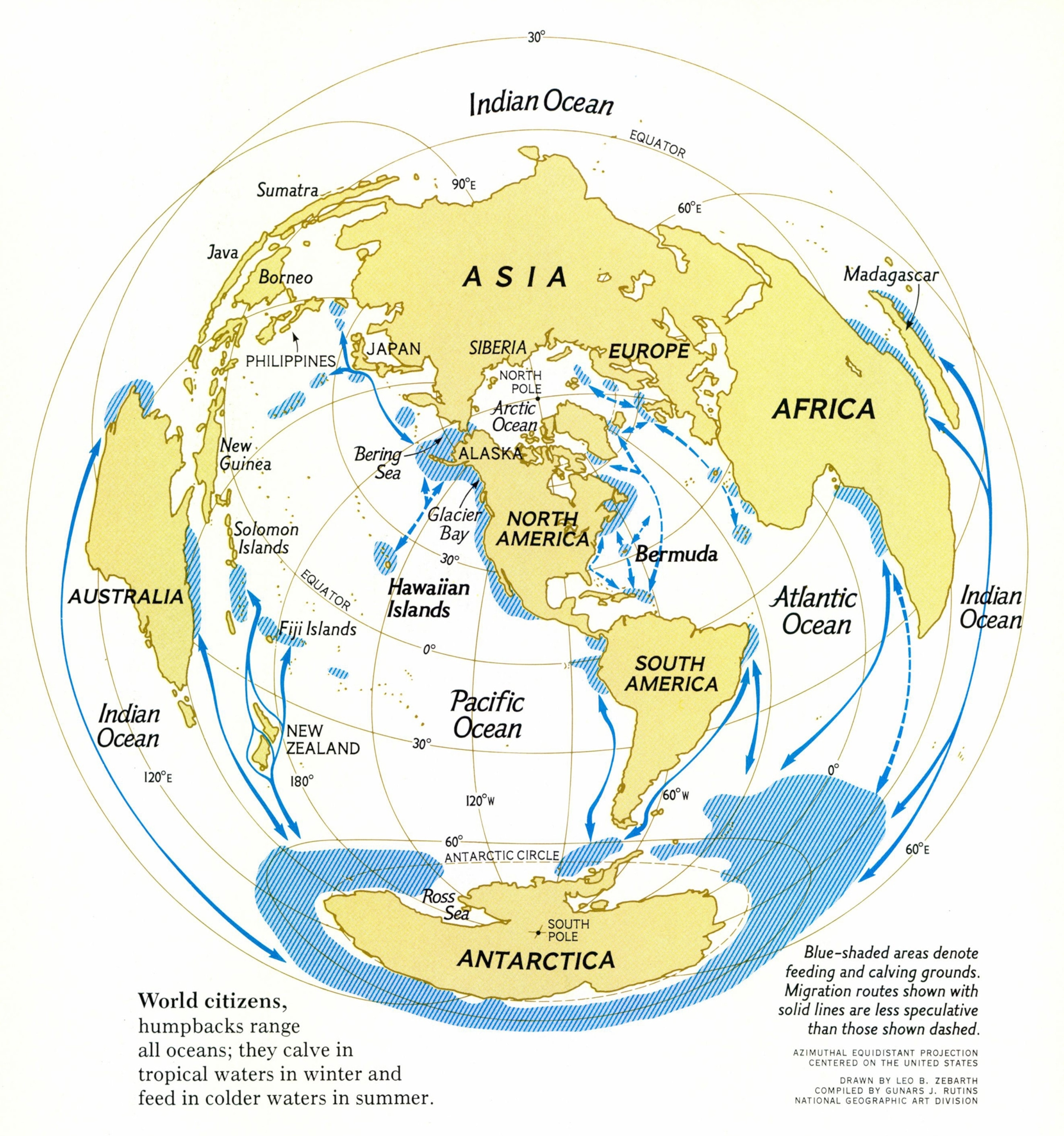 Humpback whales pass Bermuda each spring on their way north from southern calving grounds near Puerto Rico. During this period the humpbacks fill the ocean with complex and beautiful sounds. Many hours of these sounds were recorded and later analyzed with the help of a friend, Scott McVay, at Princeton University. The analysis showed that humpback sounds are in fact long songs. I use the term song not in a sense of beauty, although humpback sounds are indeed beautiful. By song I mean a regular sequence of repeated sounds such as the calls made by birds, frogs, and crickets.
