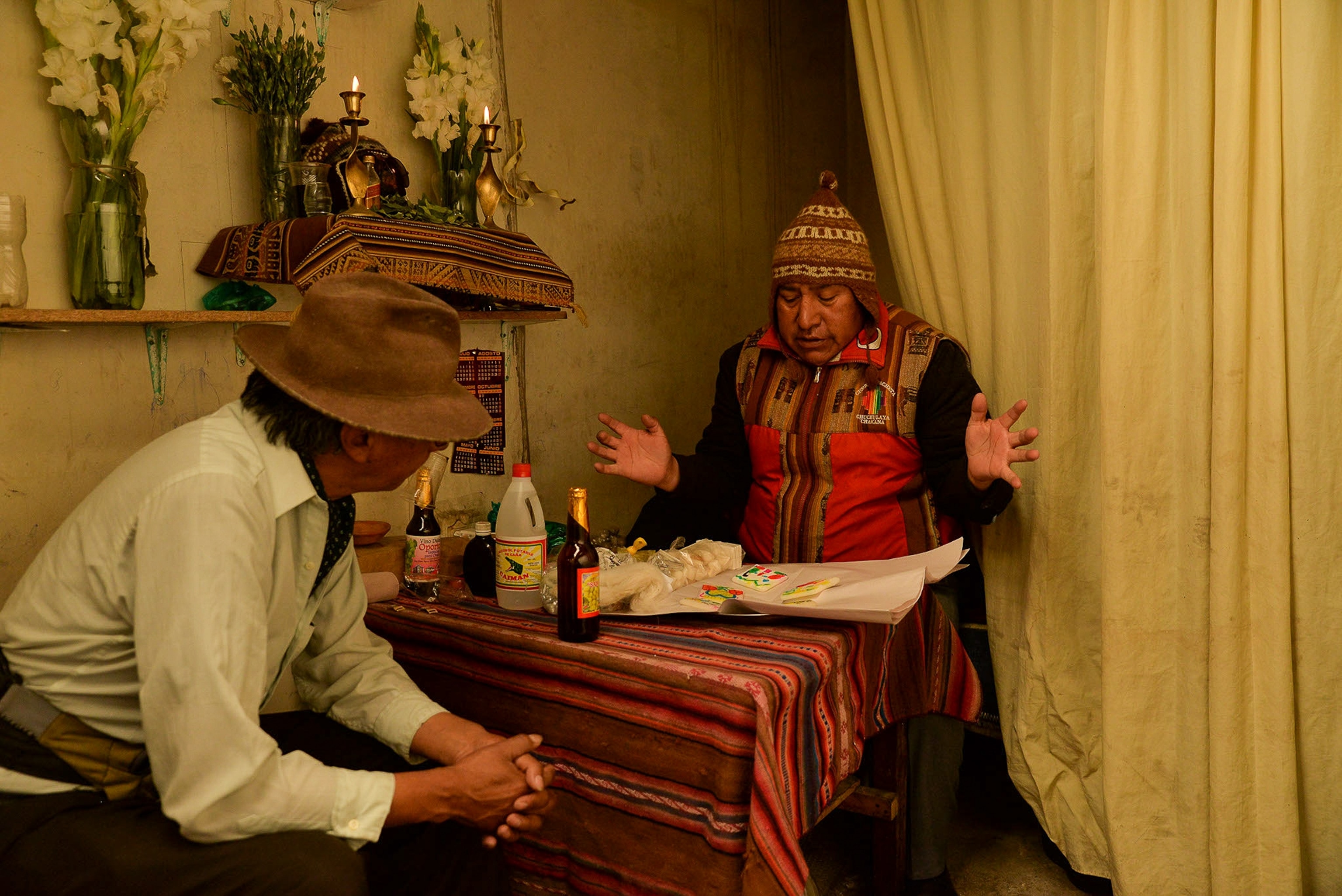 At the entrance of the traditional medicine center Kallawaya Ametra, a sign advertises medical treatments for "dislocations, fractures, fissures, detachments, and others.” Those include coca leaf treatments, celebrations to cleanse evil spirits, and rituals to venerate spirits that protect communities. Inside, Eleodoro Soto Huacatite welcomes me at his desk.