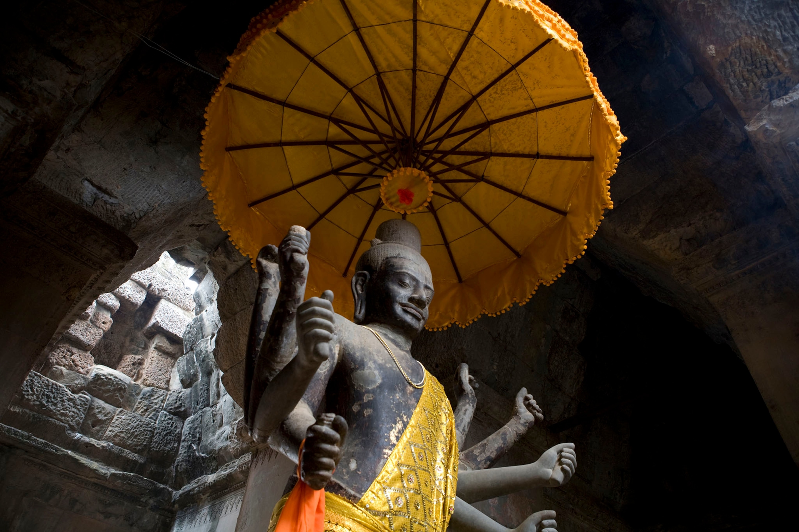 Built during the Khmer Empire, from the 9th to the 15th centuries, the massive 400-square-mile (1,036-sq-km) Angkor Wat complex rises out of the dense jungle in central Cambodia. The temple complex is not only one of the world’s largest religious monuments, it is an elaborate expression of Hindu cosmology.