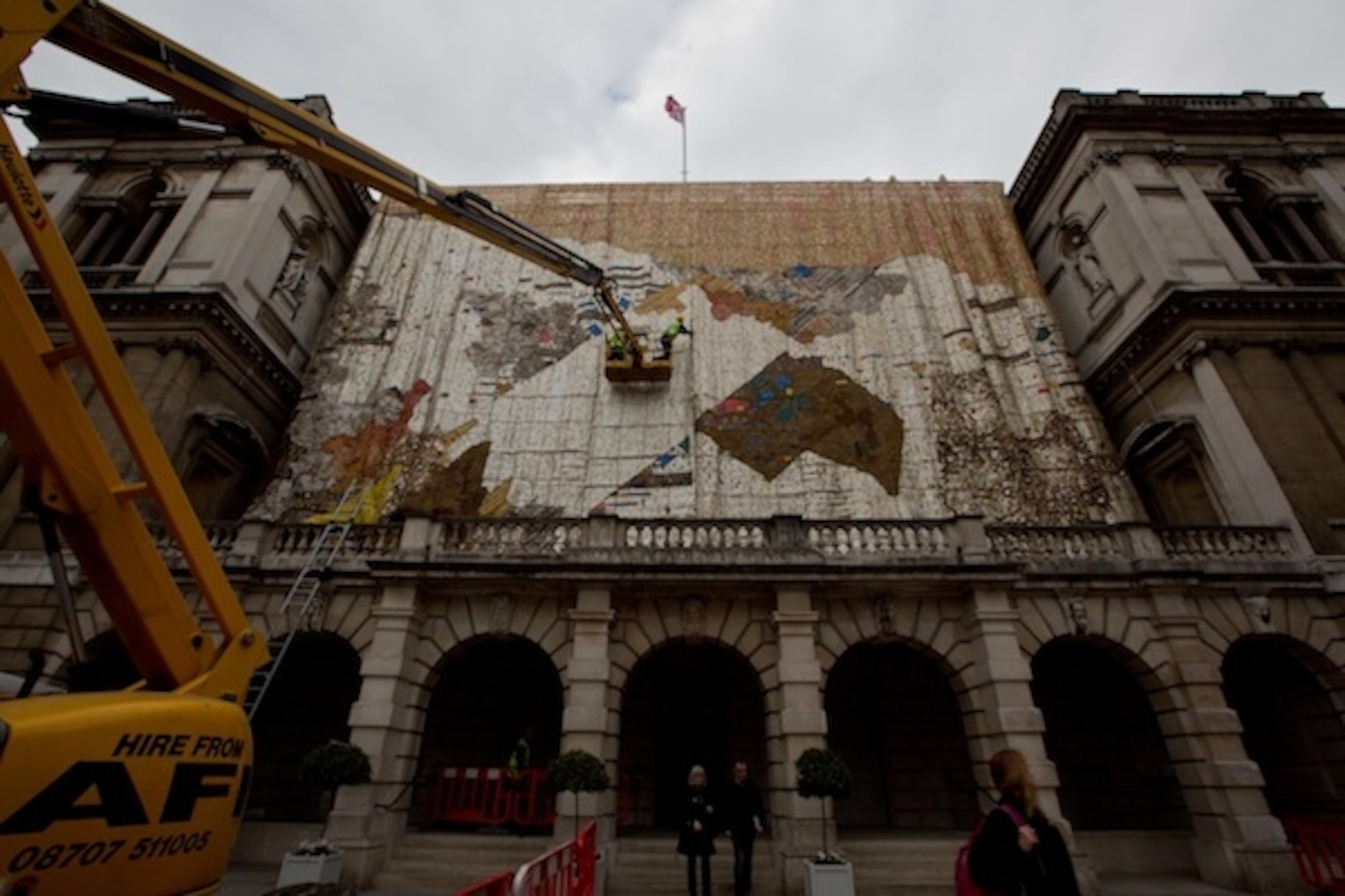 It’s not visible from the street, tucked away inside a airy courtyard. If you venture inside, there it is on the face of the grand Burlington House, which houses part of the British Royal Academy of Arts in central London. The day we walked by, workers were installing a massive hanging sculpture over the building’s entire facade. Measuring 49 feet by 75 feet, the sculpture was created by the Ghanaian artist El Anatsui, who has spent his career working with unique materials—wood, clay, occasionally metal.
