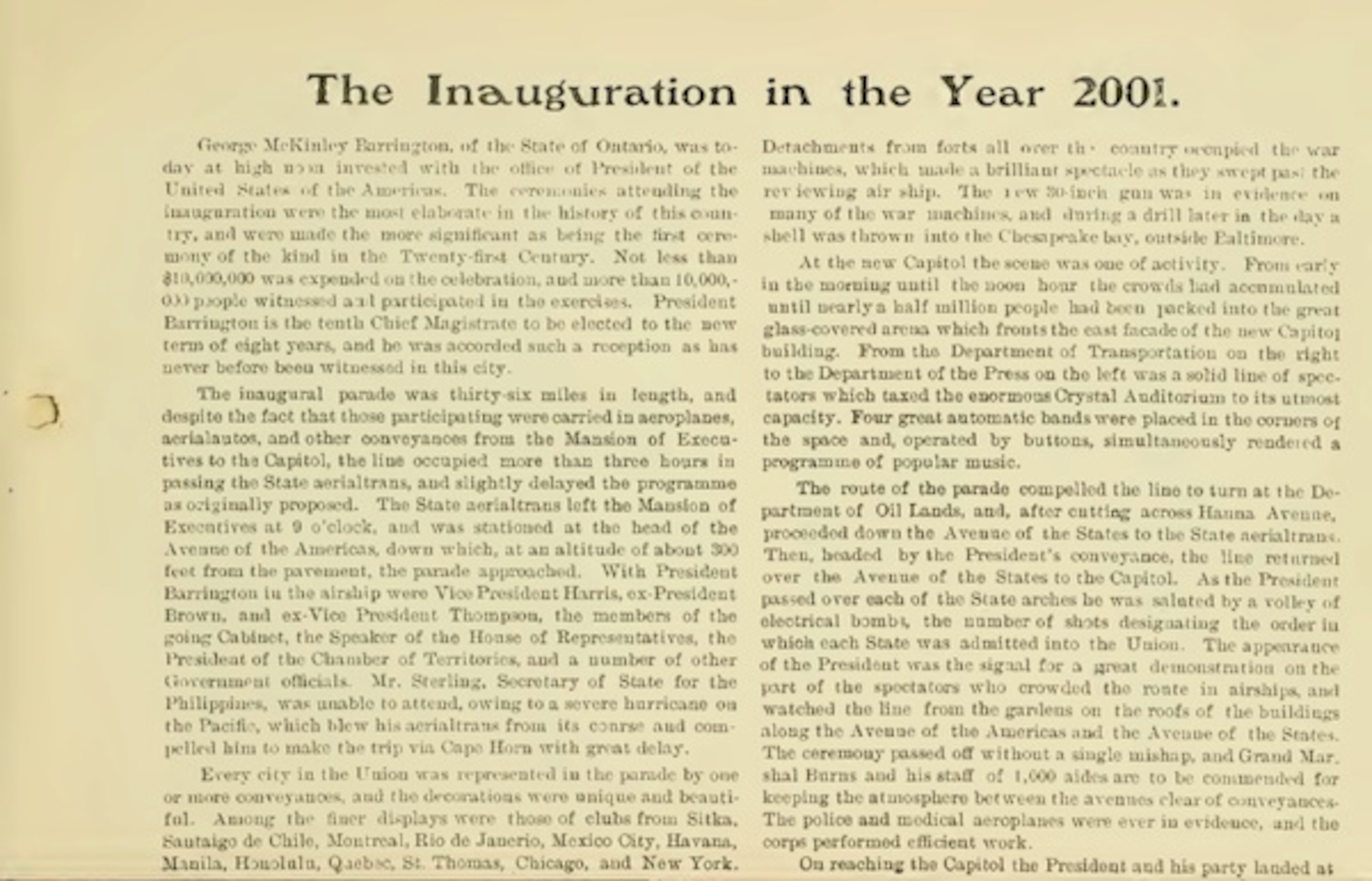 But the prescience is breathtaking in other areas. Two years before the Wright Brothers made their first test flight, people were musing about “aeroplanes” and “aerialtrains.” The inaugural address in 2001 would include a proposal to “turn the Arctic current aside, off the coast of Labrador, so as to enable the Gulf Stream to change the climate.” The fictional president would also urge strict taxation on corporations.