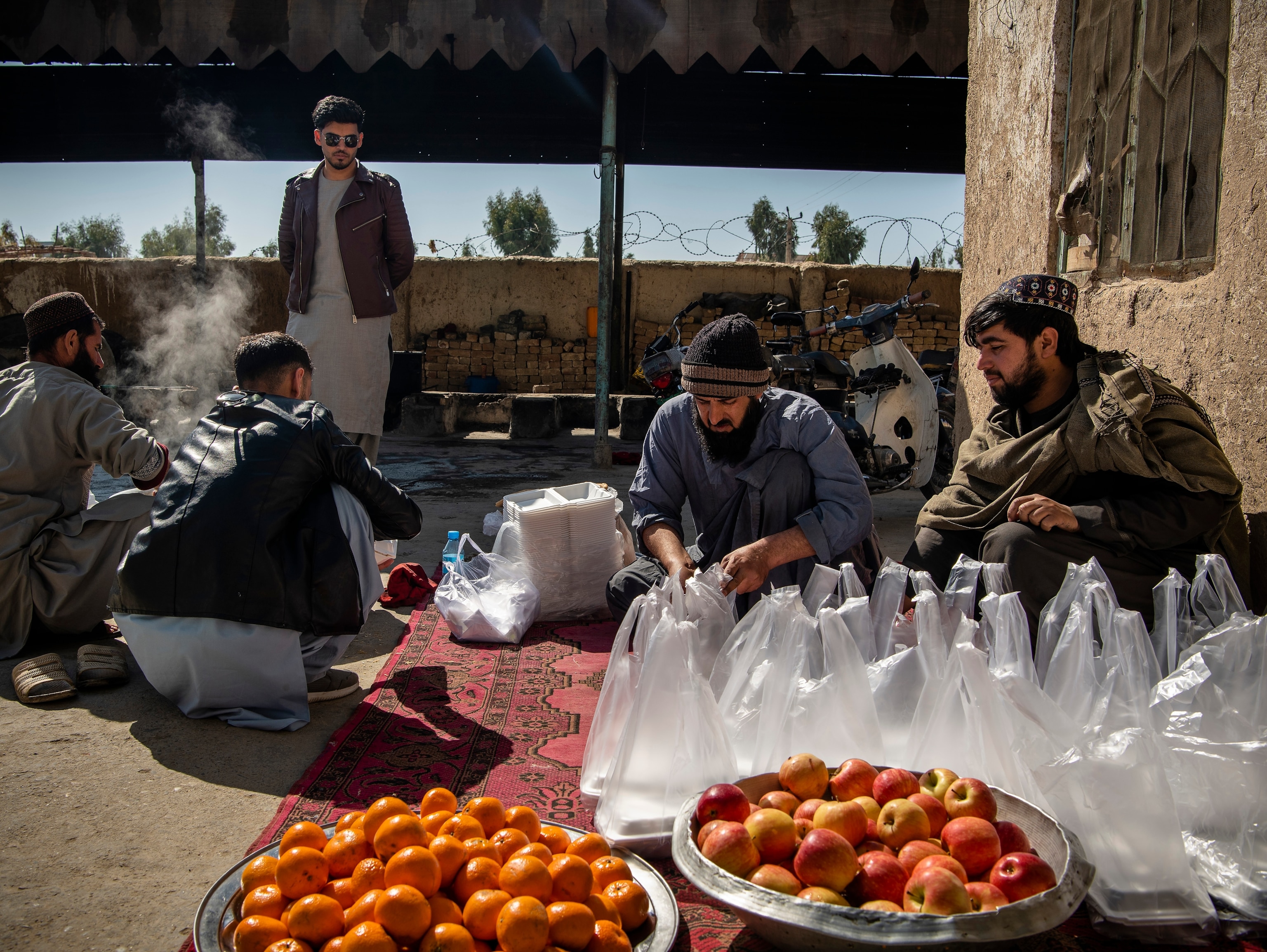 pack containers of chicken stew, bread, and fruit into plastic bags in a courtyard in Kandahar. Mohammad Kabir Hotaki (center), a chef, used to cater wedding parties but now receives more and more orders from NGOs that provide meals to poor families.