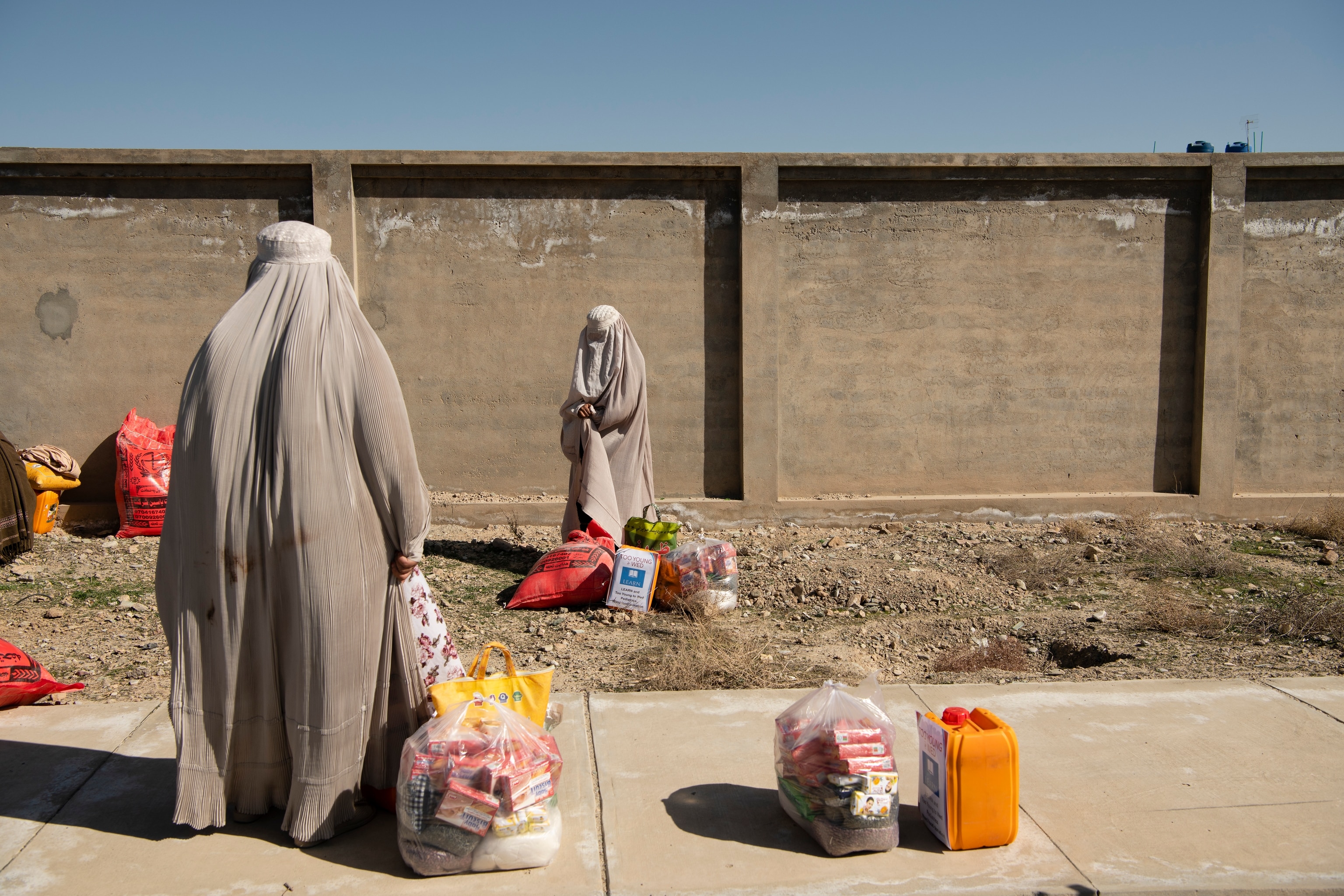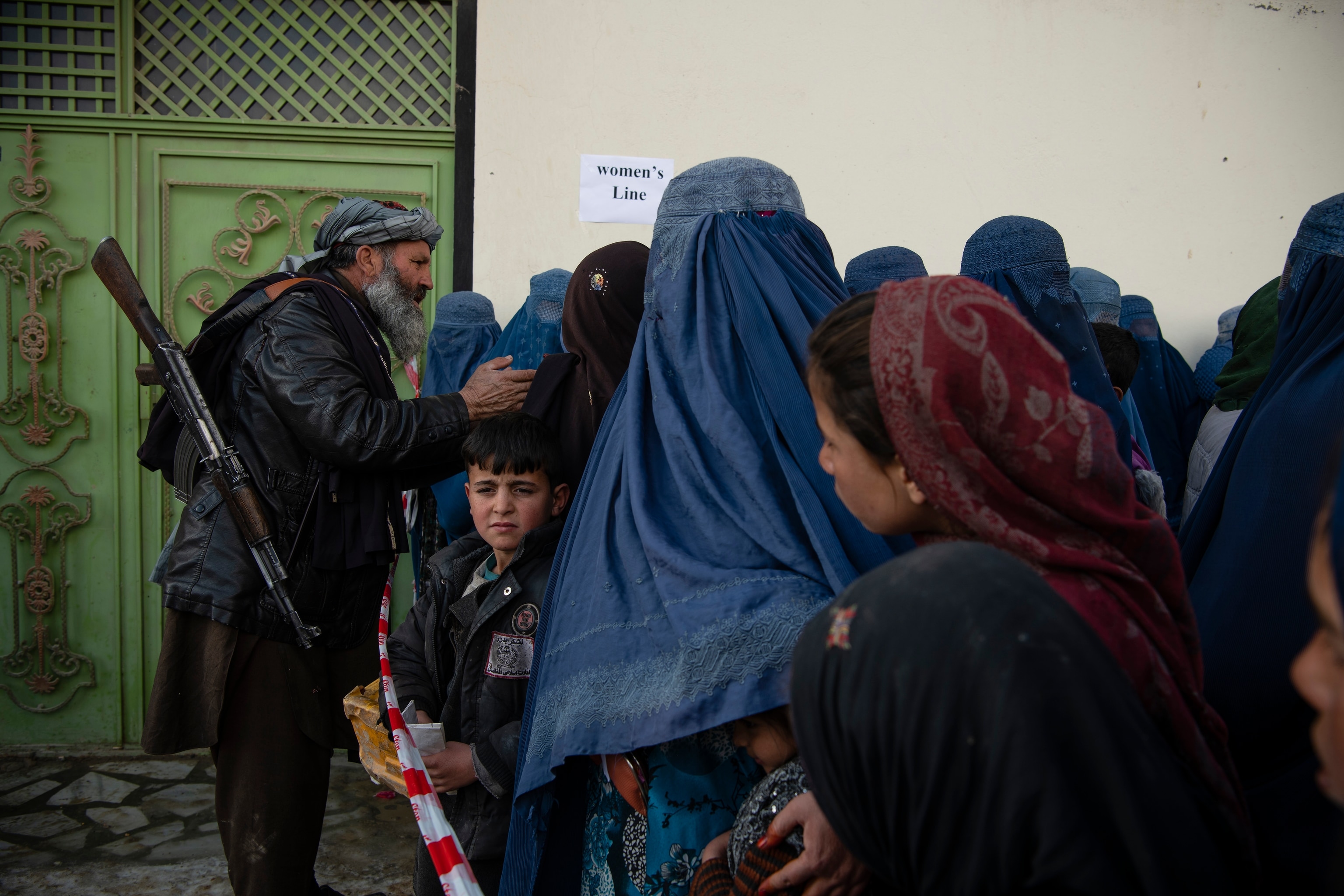 Naqibullah, a member of the Taliban, argues with women who have been waiting in line for food donations since the early morning hours in Maidan Shahr, the capital of Wardak Province in central Afghanistan. The World Food Programme distributes 600 food packages to people who have been registered in advance. However, many people without registration cards beg for aid.