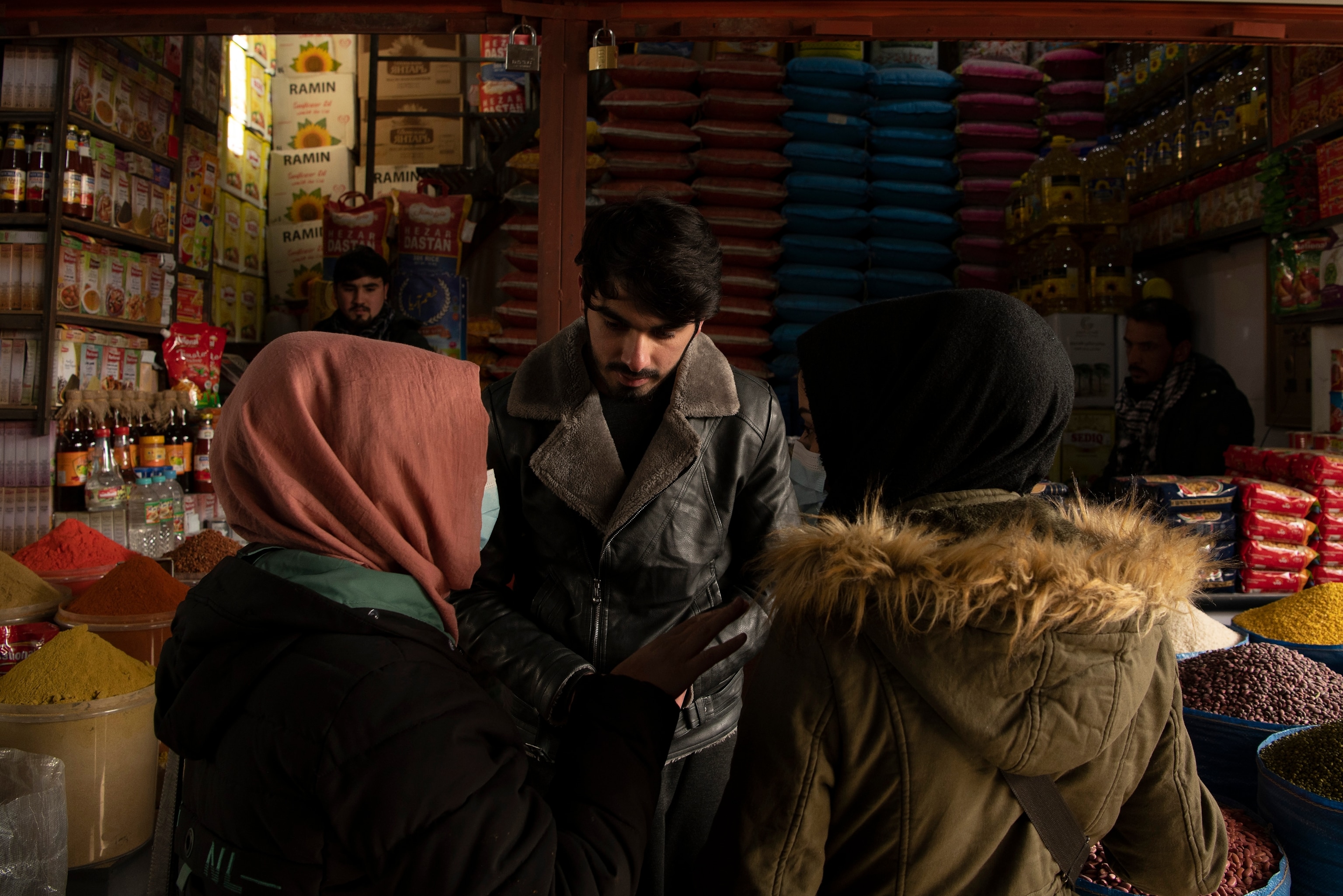 At Mandawi, one of Kabul’s largest markets, three young people buy food and other basic necessities for poor and politically vulnerable families. The colleagues are part of a network that helps families at risk with everything from food to housing. (Their names are not being used for their safety.)