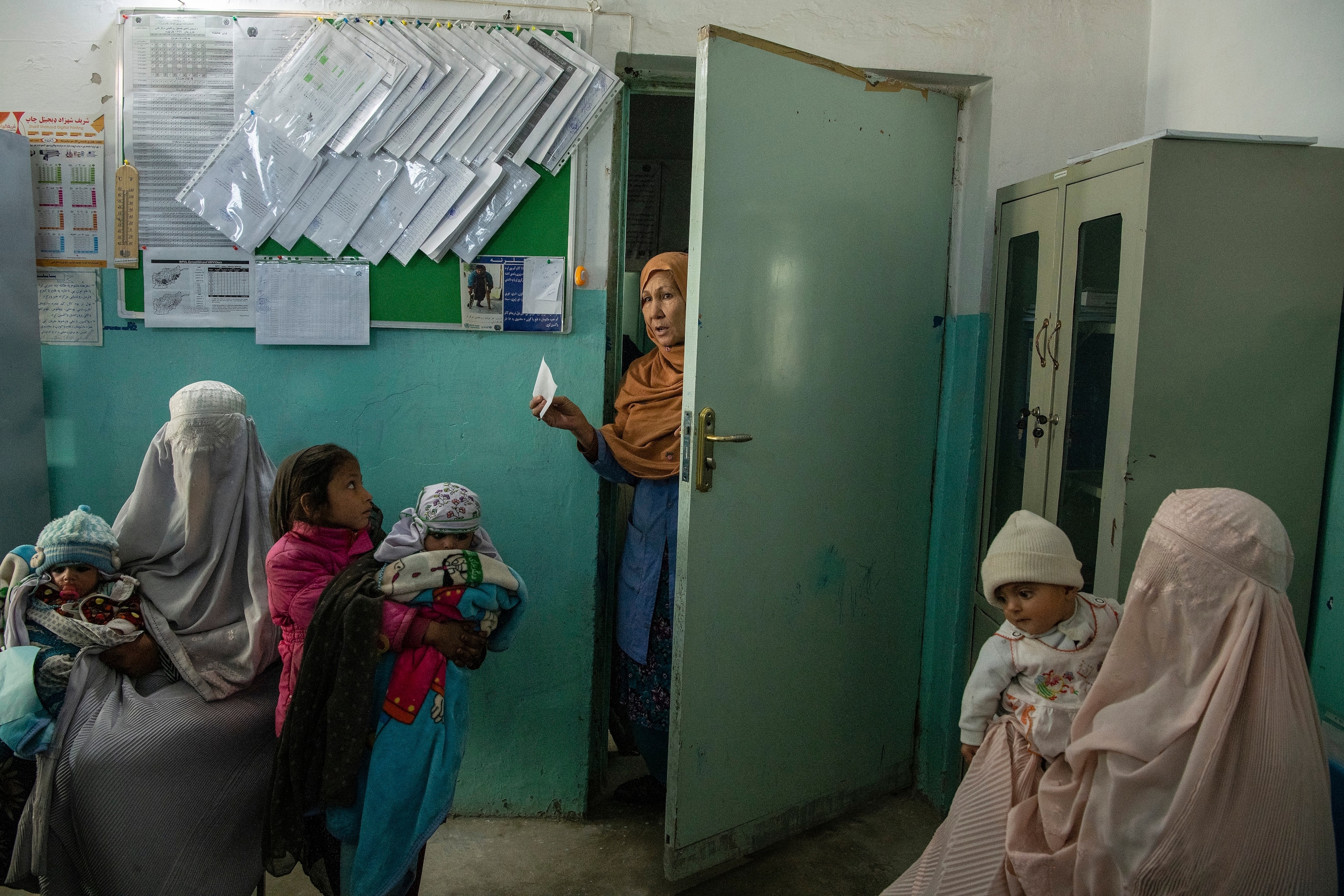 On the southern outskirts of Kandahar, women covered in sun-bleached burqas hold children in their arms as they wait outside a small health facility.