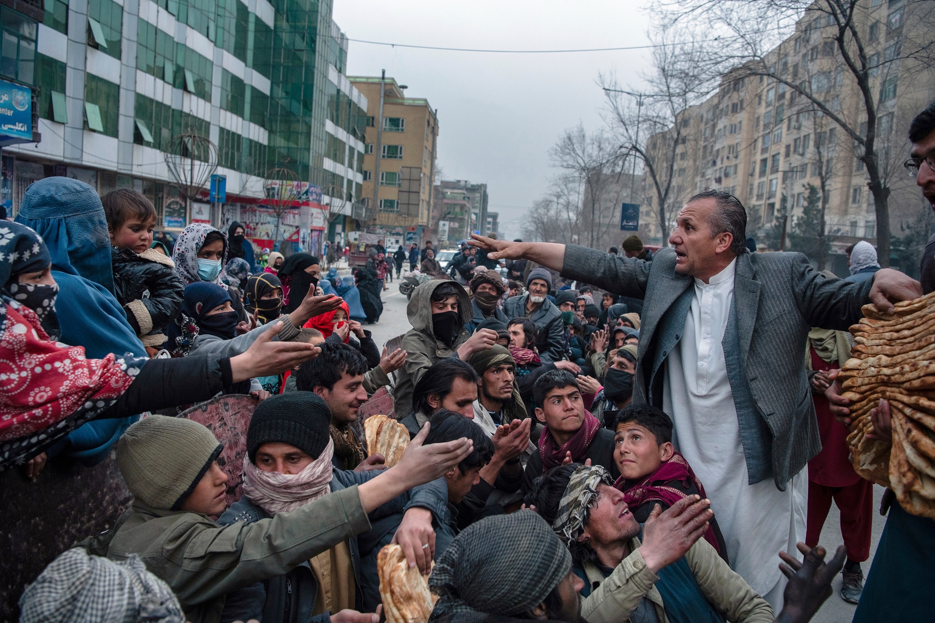 Mirdil Rahmati, who owns several bakeries in Kabul, distributes free bread to those who gather in front of his bakery in the Khair Khana neighborhood.