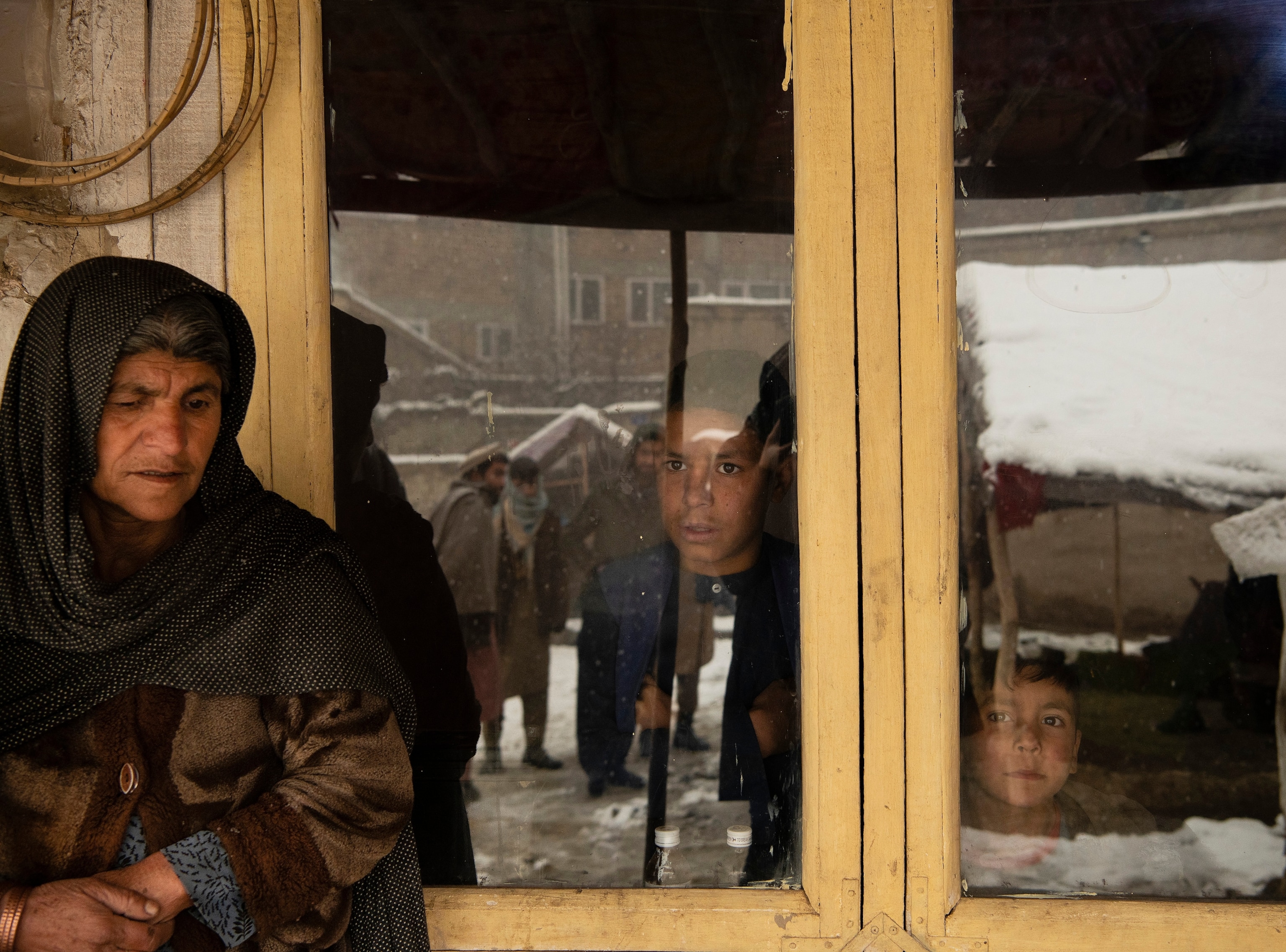 Latifa, 55, stands outside as her grandchildren peer through a window of the family's makeshift house. They moved to the Qala-i Wahed neighborhood of Kabul when they were displaced from their home province of Parwan, north of the capital city. Last year, the plastic roof collapsed after a heavy snowfall.