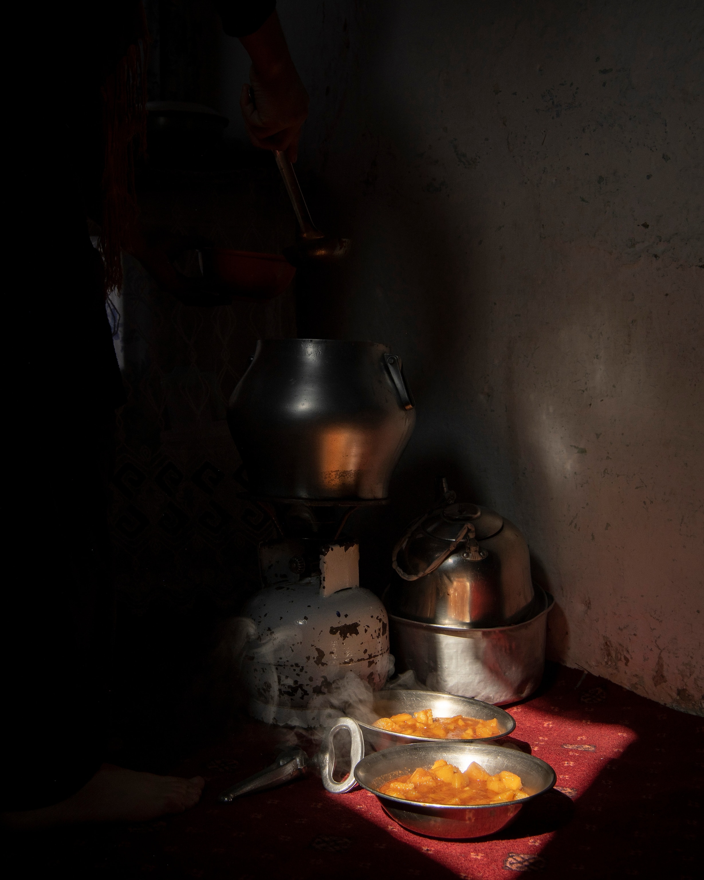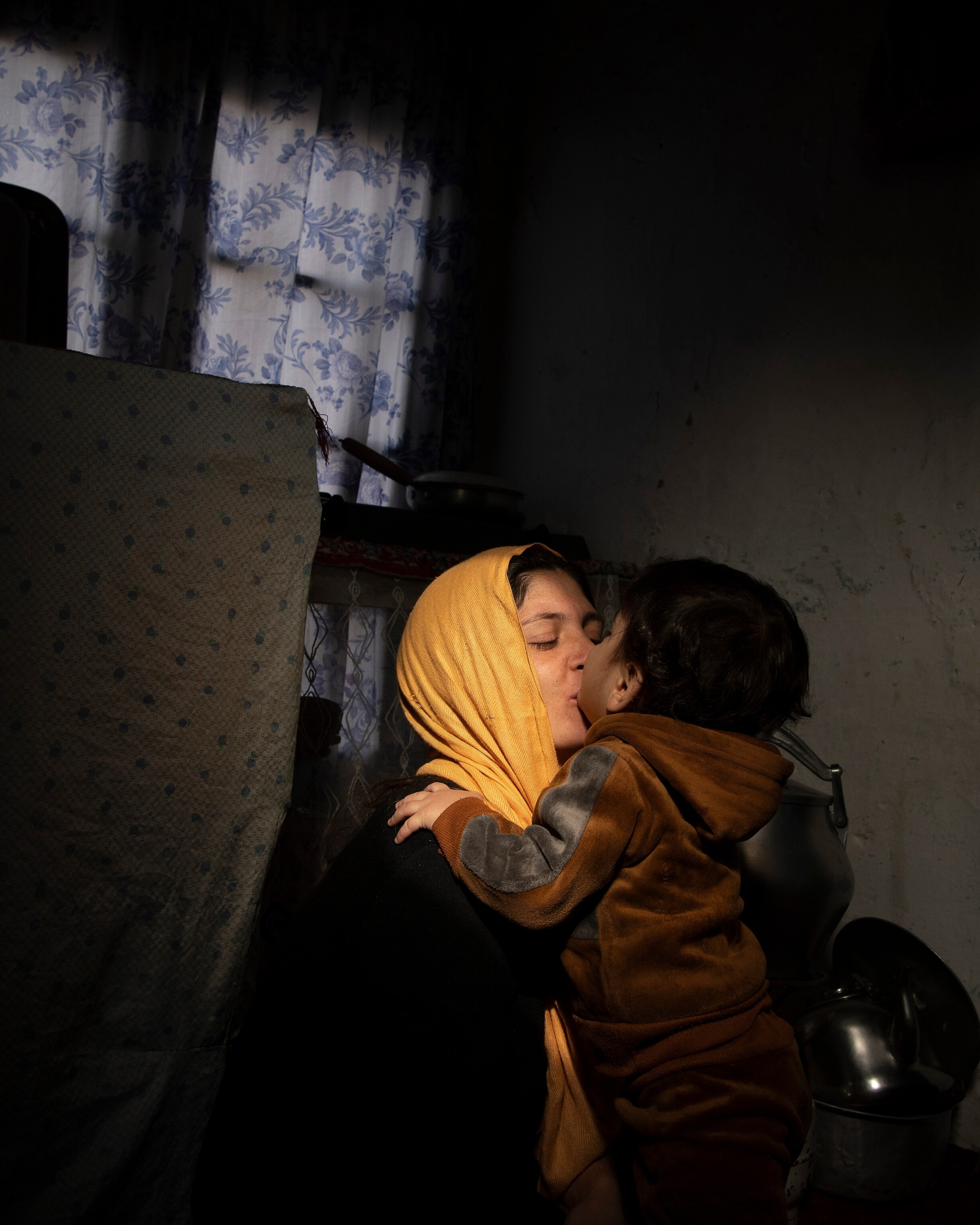 Two-year-old Nabi gives his mother, 21-year-old Mursal, a kiss (left). Mursal is pregnant and her husband, Sharif, has had a hard time finding work since the previous government collapsed. The family has been subsisting on potatoes, bread, and rice. For a recent lunch, Mursal added tomato paste to the potatoes (right).