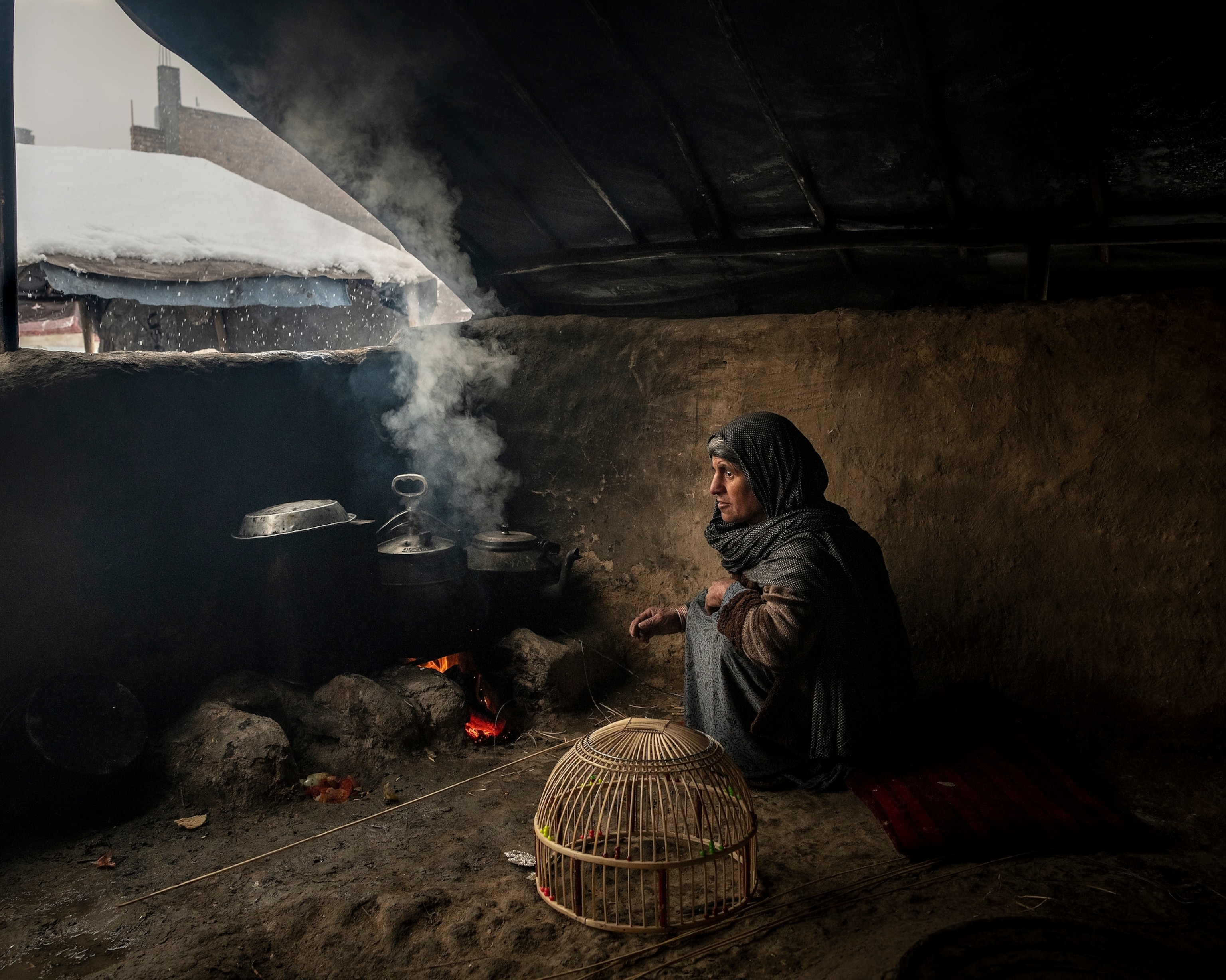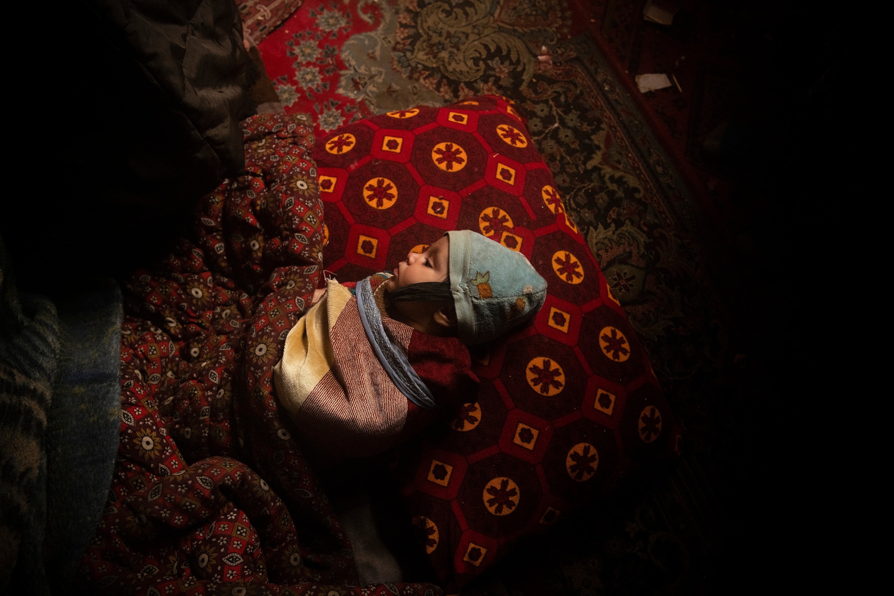 A two-month-old baby boy is placed near the only source of heat in his family's home in the Qala-i Wahed neighborhood of Kabul.
