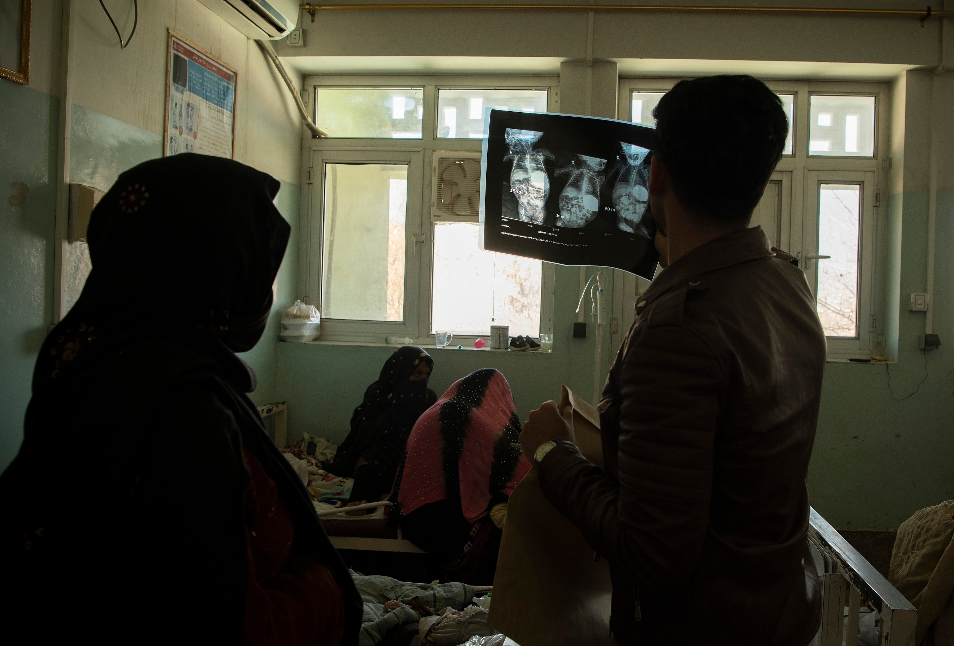 Navid Amini, a medical student and aid worker, examines an X-ray of one of the 45 children under five hospitalized for malnourishment at Mirwais Hospital in the southern city of Kandahar. Amini distributes meals to patients in need as part of his work for LEARN Afghanistan, a local education NGO that branched out to providing emergency aid after the Taliban takeover.