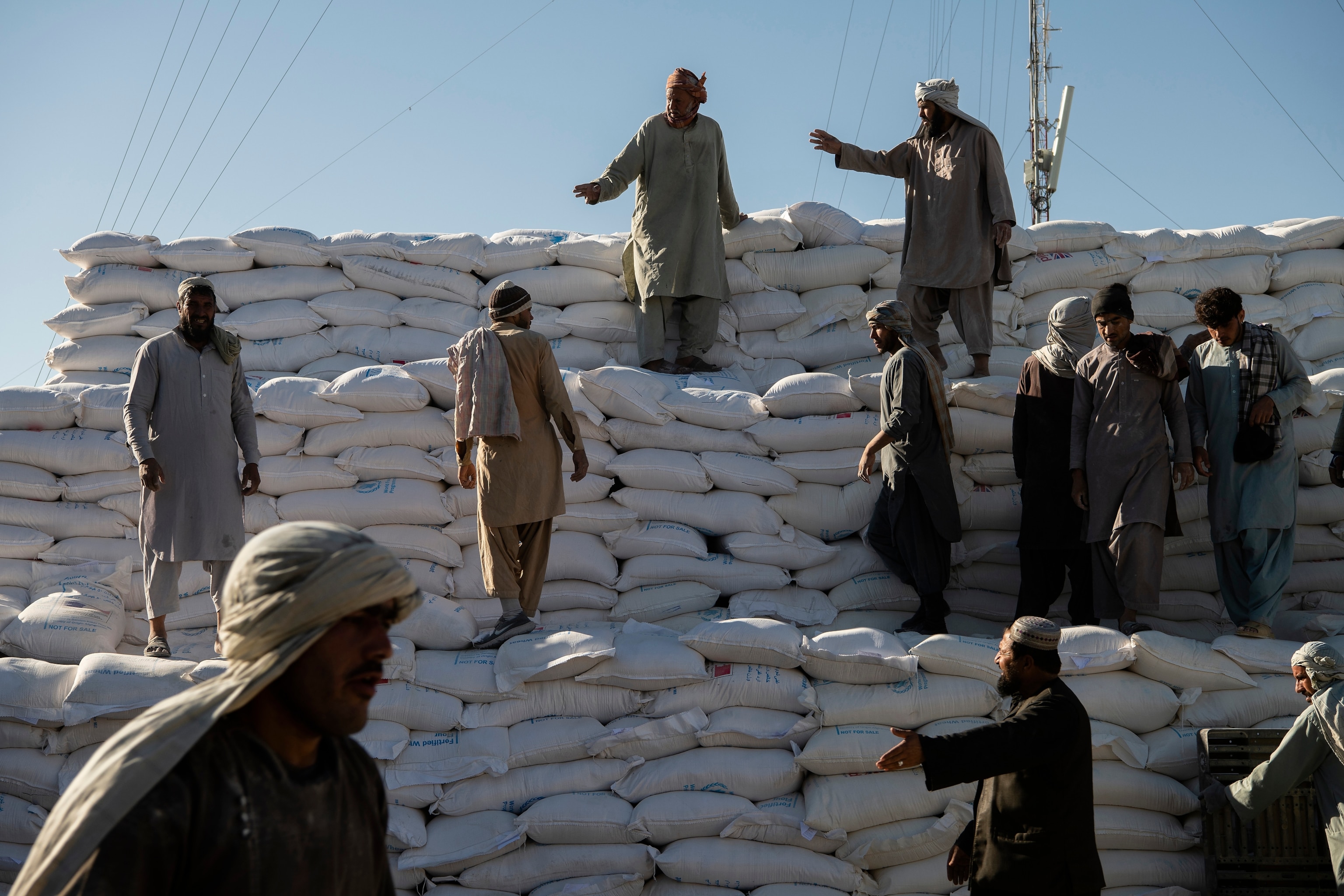 Laborers offload 900 sacks of flour from a truck that has arrived at the World Food Programme’s warehouse in Kandahar. The flour, along with sunflower oil, extra-nutritious meals for infants, and other essential food products, will be distributed across six provinces in the country's south and west.