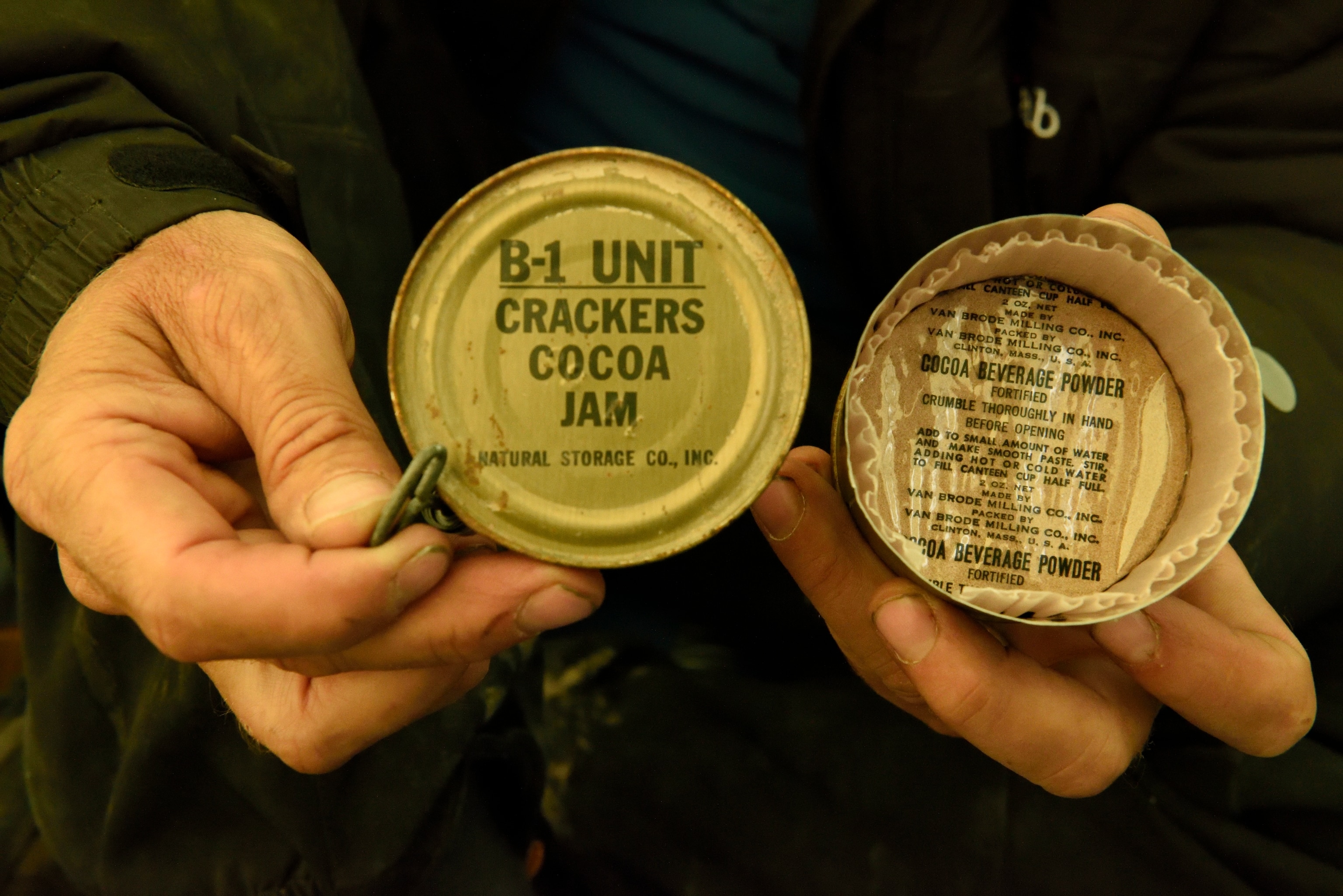 Blakeley counted 14 tins in all, still nestled in the original paper wrapping labeled “Combat Ration Individual” in bold, black lettering, mummified by Greenland’s dry, icy climate.