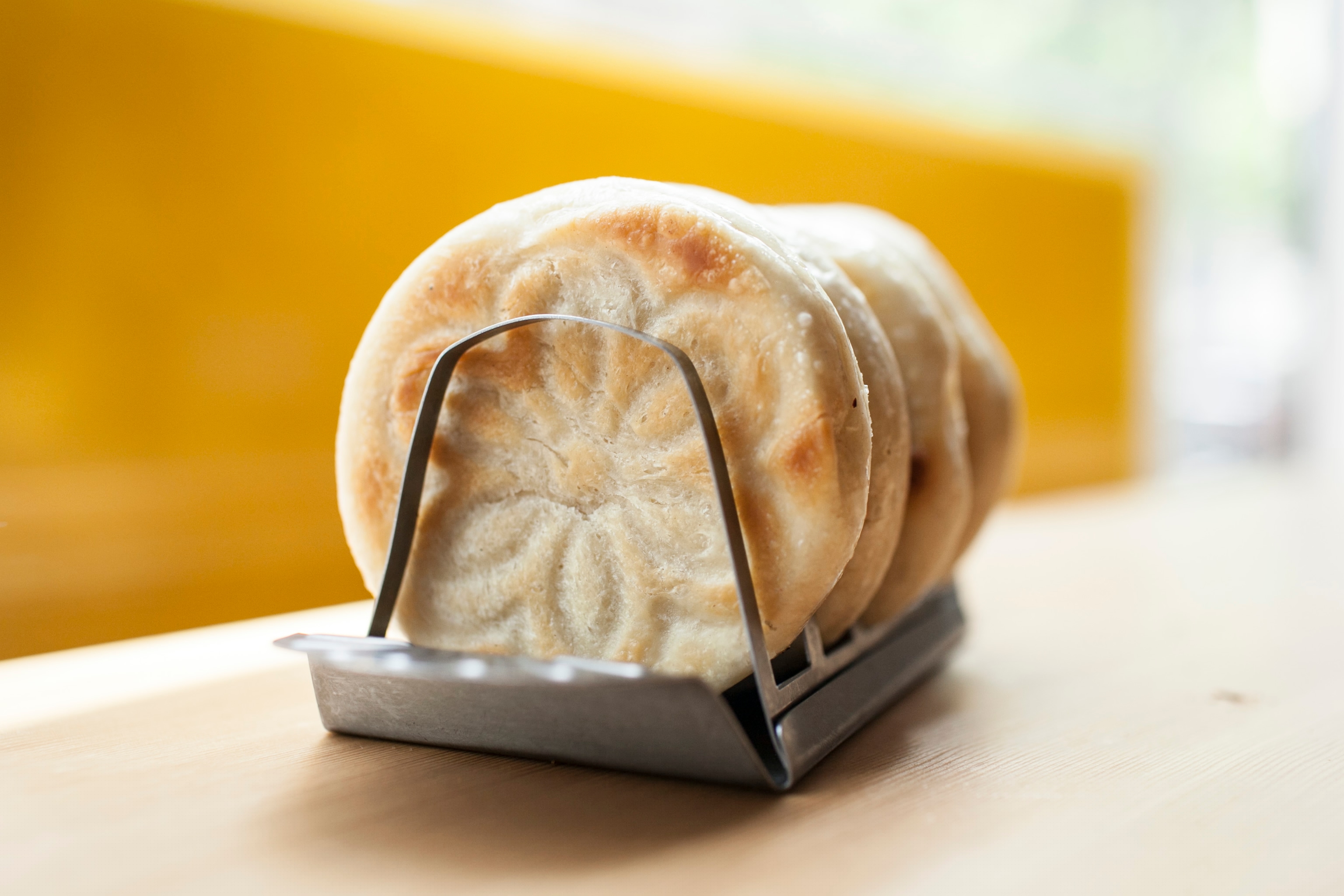 Before we talk about the trip, let’s talk about what makes tigelle so appealing. Think of them as the lovechildren of an English muffin and a pancake. Tigelle are shaped like disks, slightly browned (thanks, Maillard!) crisp on the outside, and soft and steamy on the inside, ready for the spread of your choice. Or, you can just wolf them down, plain and yeasty and hot.