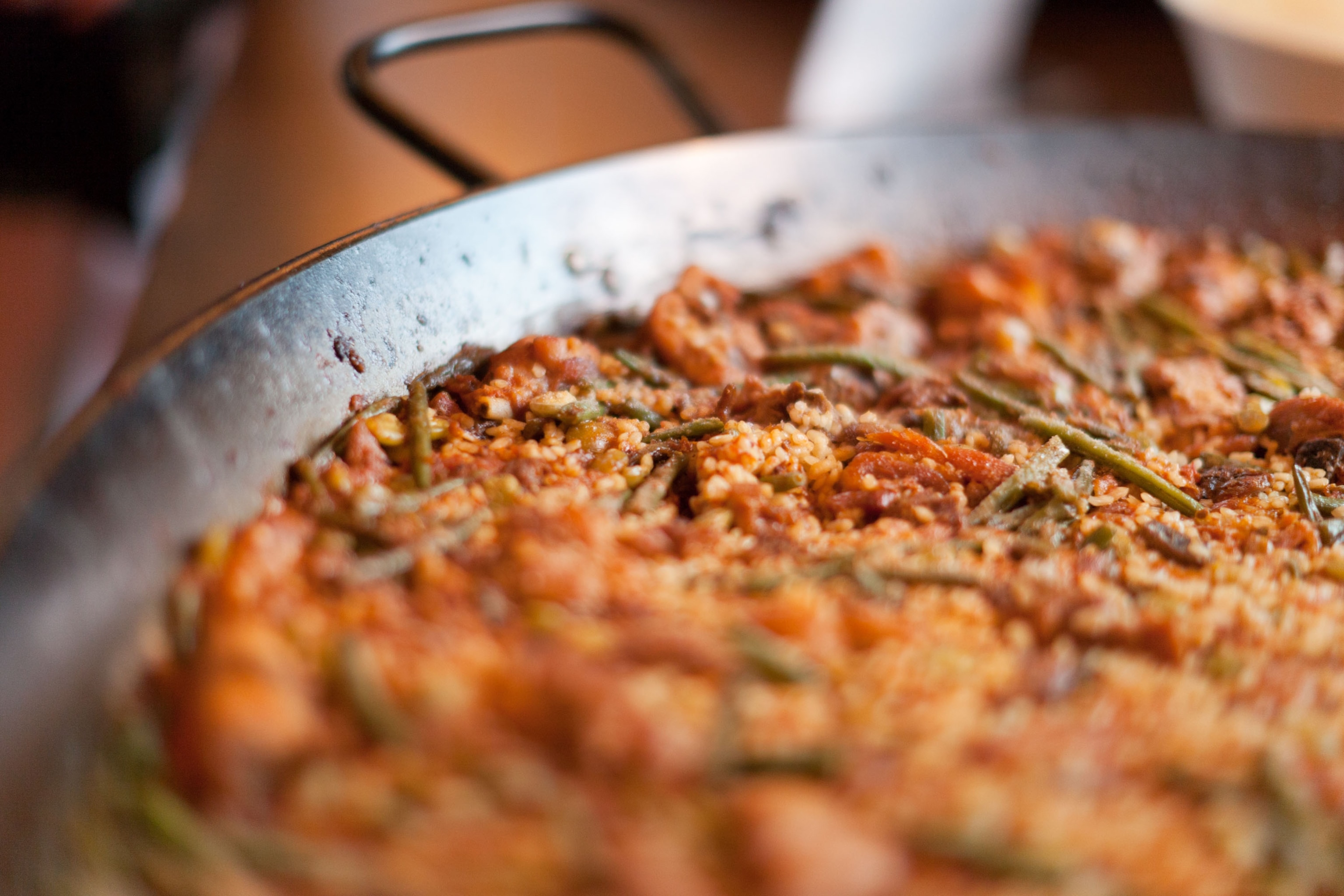In a large sauté or paella pan, heat 1 tablespoon of oil over medium-high heat. Sear the chicken wings and tenderloins until they are golden, about 2 minutes, and remove from the pan and set aside. Add the garlic to the pan, cook for 1 minute, and then stir in the green beans and cook for 1 minute more. Add the chicken liver and gizzard and the tomato purée and stir to combine. Next add the water and bring to a boil. Once boiling, add the rice and stir until the ingredients are distributed evenly throughout the pan. Return the wings and the tenderloins to the pan. Lower the heat to a simmer and cook for 20 minutes without stirring. While the rice is cooking, toss the cucumber and tomatoes together with a little oil and salt to make the pipirrana. Serve the rice garnished with the pipirrana.