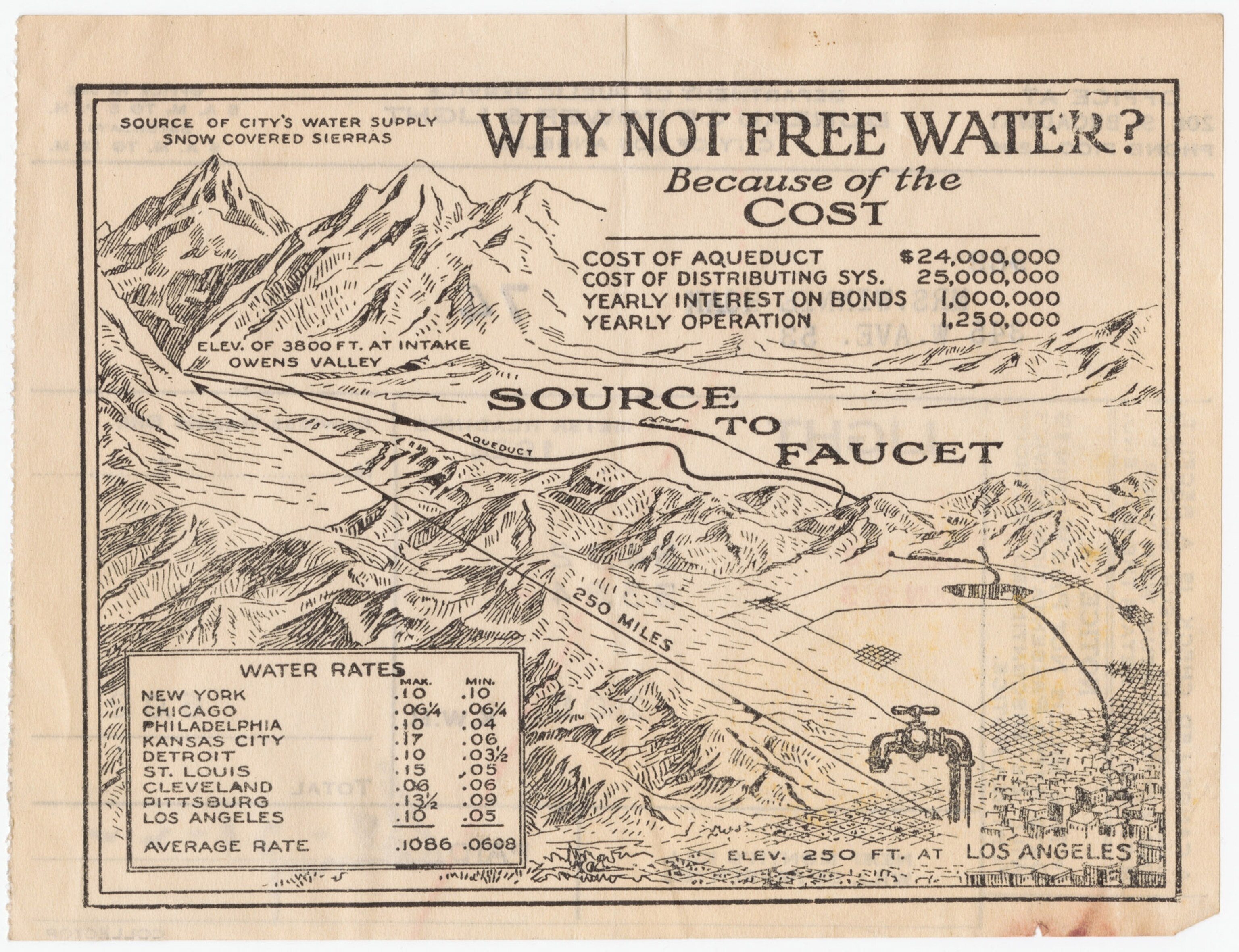 The map above, from the back of a 1922 electric bill, was designed to convince residents of Los Angeles that it was fair for them to have to pay for their water. The map shows the $50 million aqueduct’s nearly 250-mile route from the Owens Valley in the Sierra Nevada to homes in L.A.