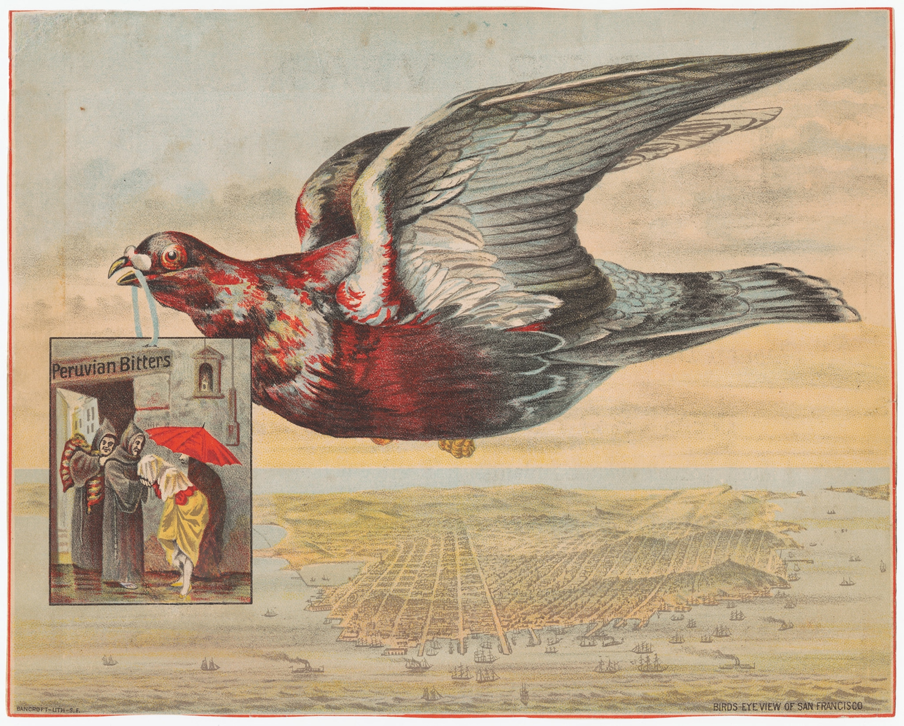The front side of the flyer (above) features a pigeon flying over a lovely map of San Francisco, carrying a scene that shows a woman kissing the hand of a monk (who is presumably providing her with the Peruvian Bitters miracle cure).