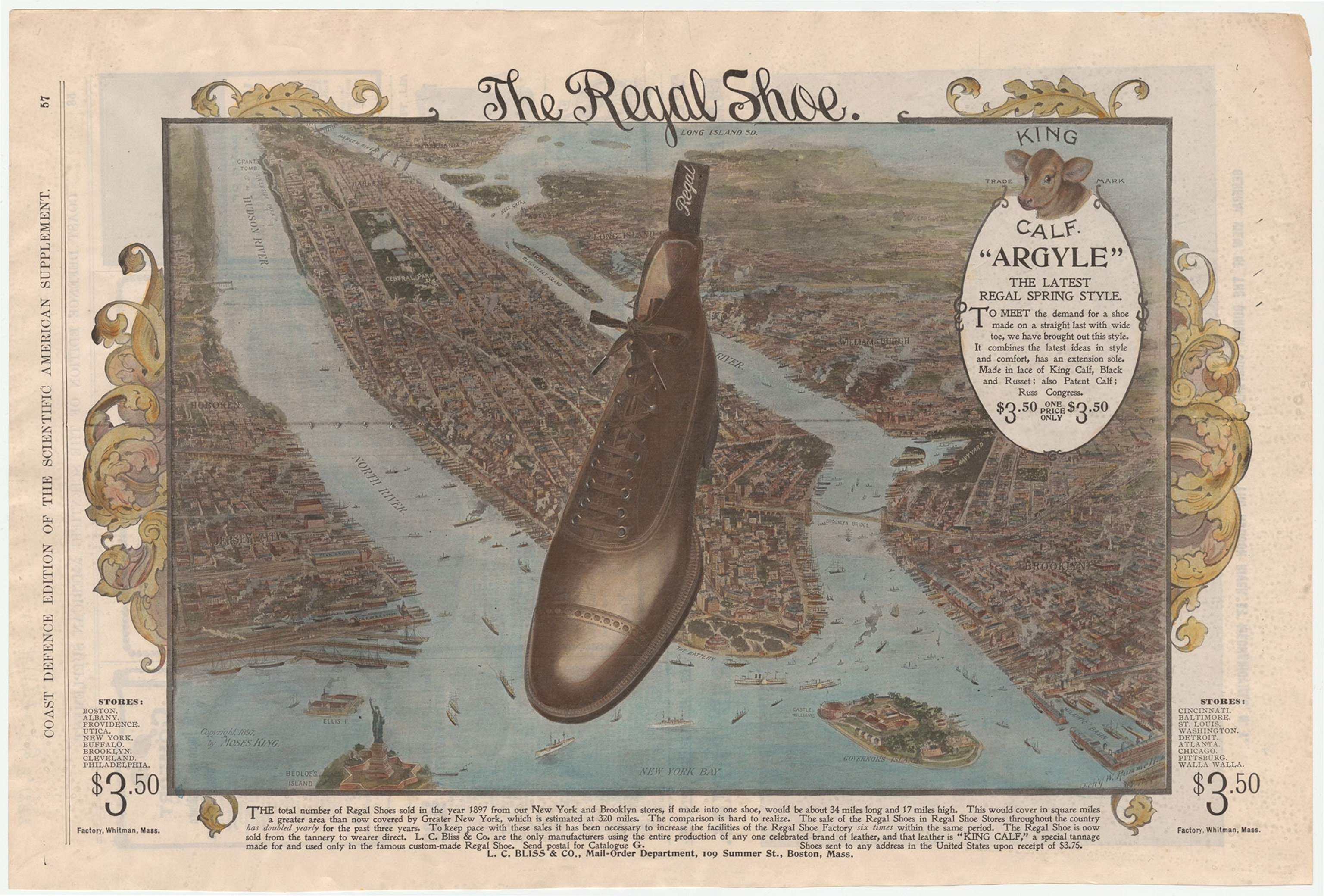 In a somewhat odd attempt to justify superimposing a giant shoe on a map of Manhattan, L.C. Bliss & Co. included this factoid in its 1898 ad for shoes: “The total number of Regal Shoes sold in the year 1897 from our New York and Brooklyn stores, if made into one shoe, would be about 34 miles long and 17 miles high. This would cover in square miles a greater area than now covered by Greater New York.”
