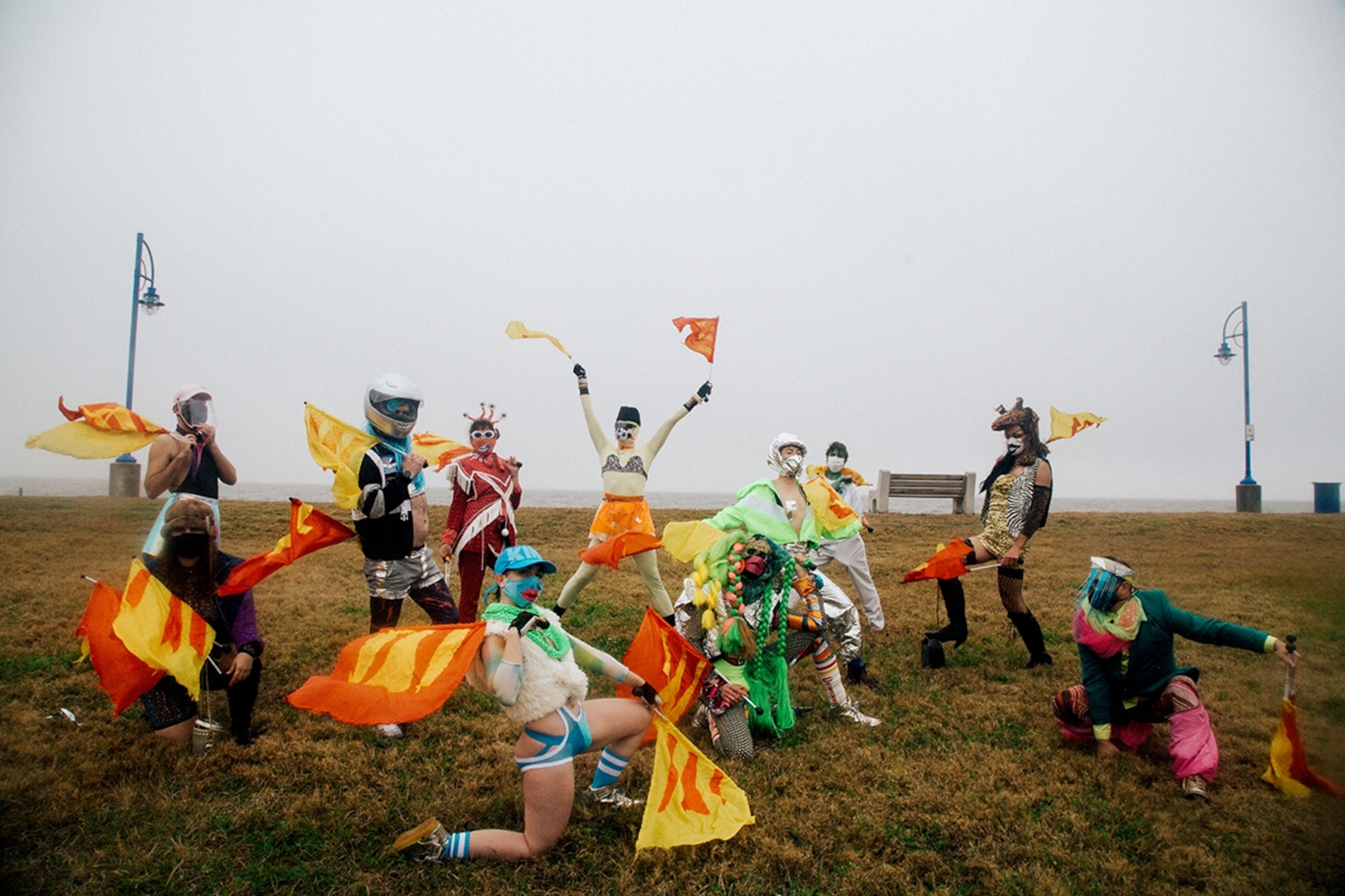 The Saturday before Mardi Gras was cold and blustery. But amid the gray a burst of color lined the banks of Lake Pontchartrain, where the Flaming Flagettes—dressed like an intergalactic color guard at a discotheque—navigate dance moves in platform heels.