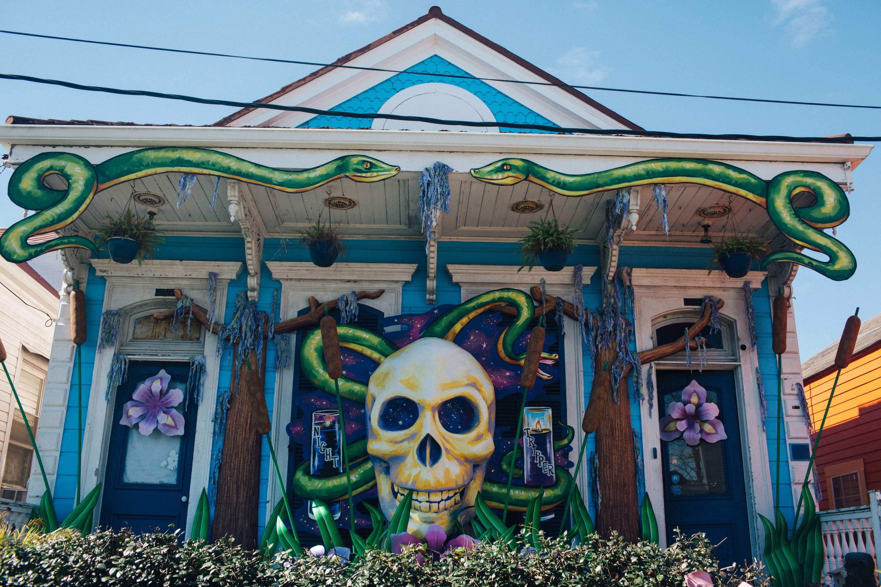 In the wake of the city’s decision to cancel all Carnival parades in 2021, a grassroots effort quickly took hold: hire local artists to decorate homes as though they were parade floats. Soon neighborhoods were awash in jewel tones, metallic streamers, and funky creations honoring local traditions and beyond, from Cajun cooking to Shark Week.