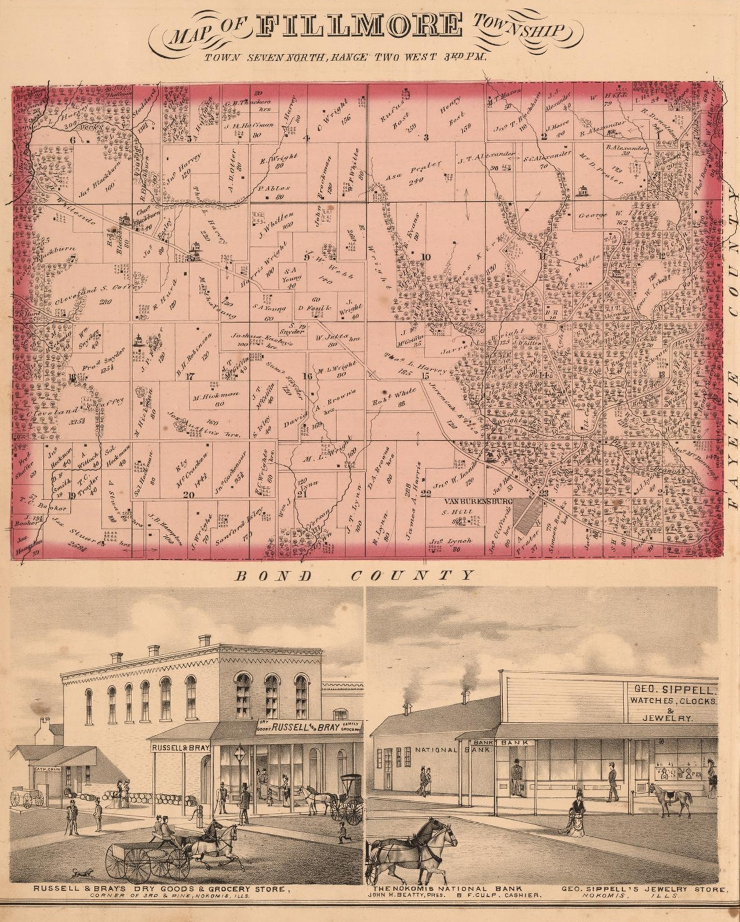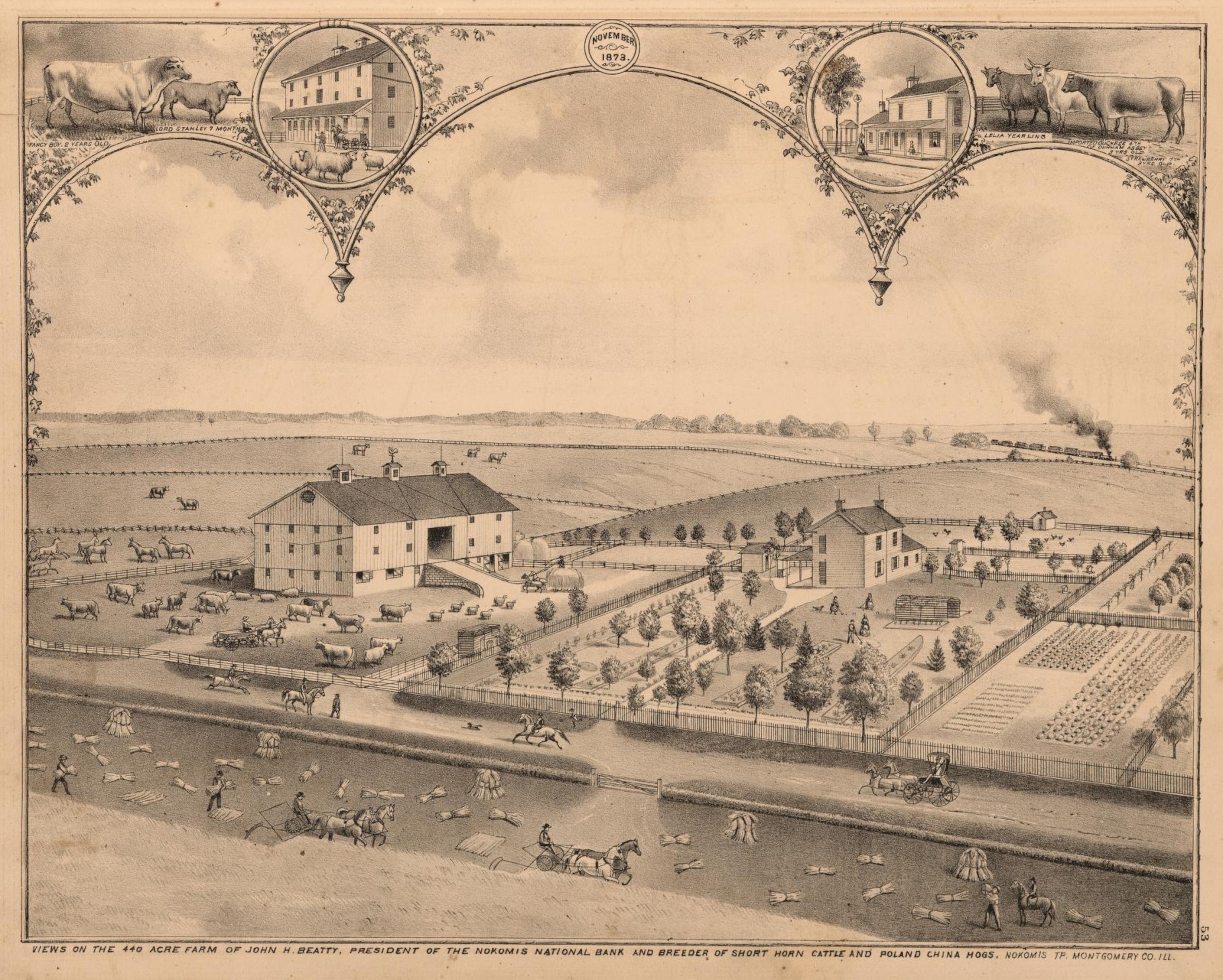 The images in this post are from a single atlas of Montgomery County, Illinois, published in 1874 by Brink, McCormick & Co. Wesley Brink, who published under several company names, was known for some of the most picturesque atlases (winemaker John Moore’s Tower Place Farm appears in an atlas made by another prominent company, Andreas, Lyter & Co.).