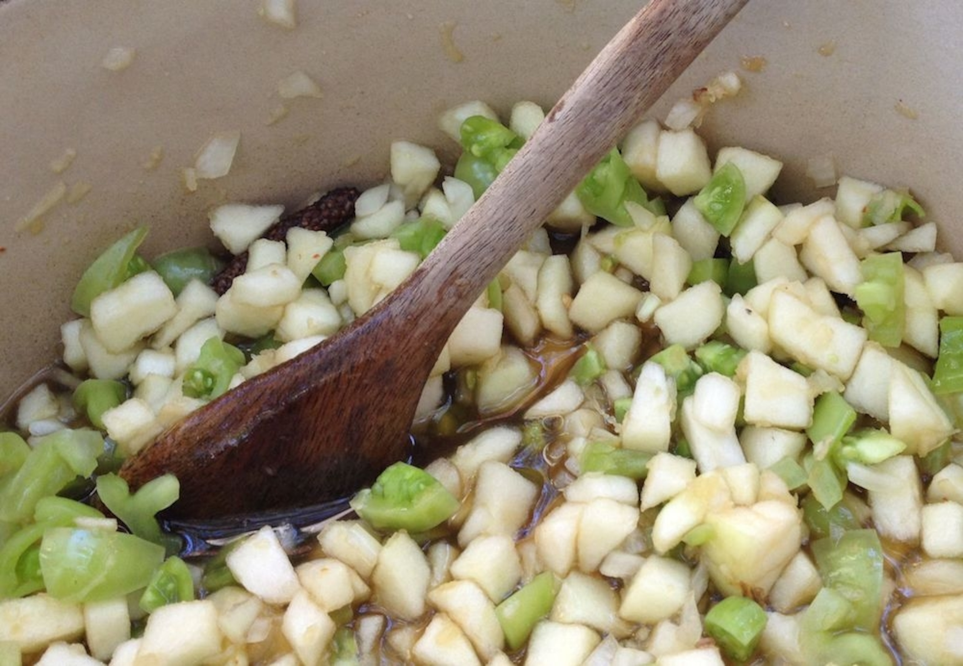 I brought them out of the crisp air and evaluated them. They were thick-walled and so immature they had more texture than taste, too sturdy to make good salsa and too small to fry. I rooted through the refrigerator and cabinets; I had apples, onions, fresh ginger, brown sugar, coriander, cardamom and vinegar. I would make chutney.