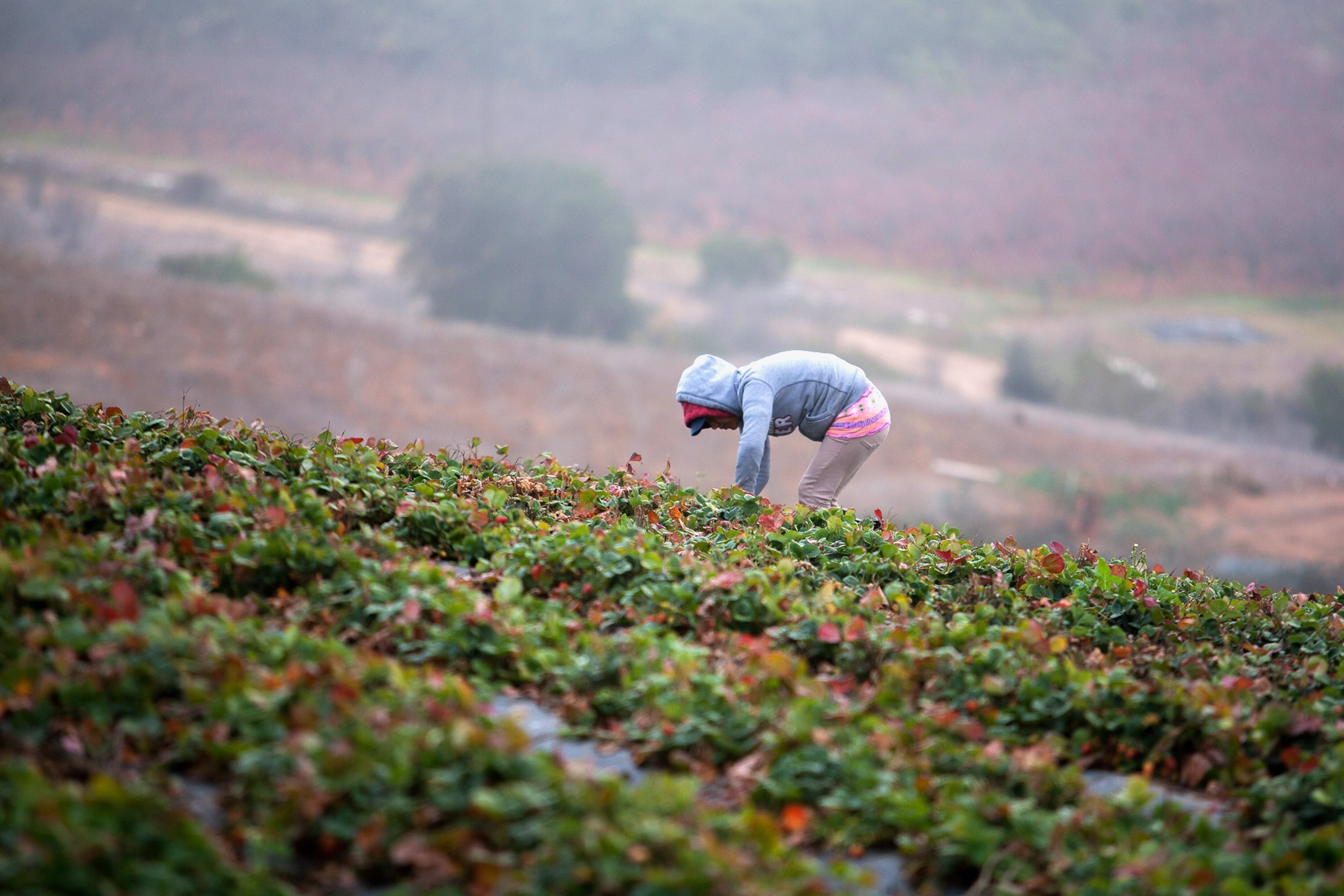 A laborer picks strawberries at J.R. Organics Farm in Escondido, California.