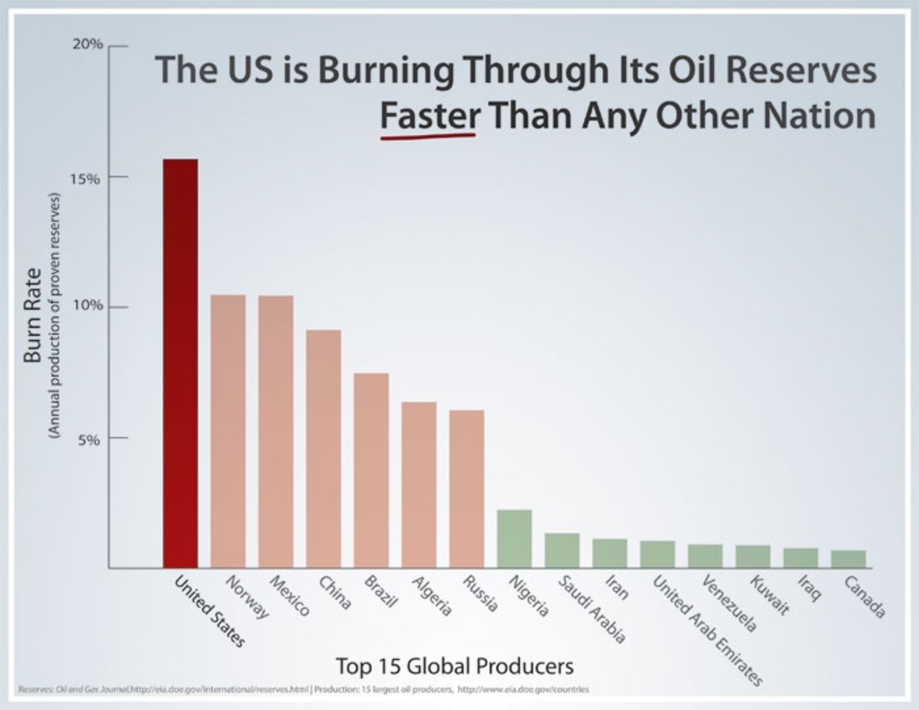 Increasing supply in the short run hurts us in the long run: Our meager 2% of global oil reserves is unlikely to grow significantly over the long run, so every barrel we take out now is one less that we can take out in the future. In a House Energy and Commerce Committee hearing last week, Congressman Ed Markey put up the following chart showing that the U.S. is drawing down its reserves faster than any other major oil producing country:
