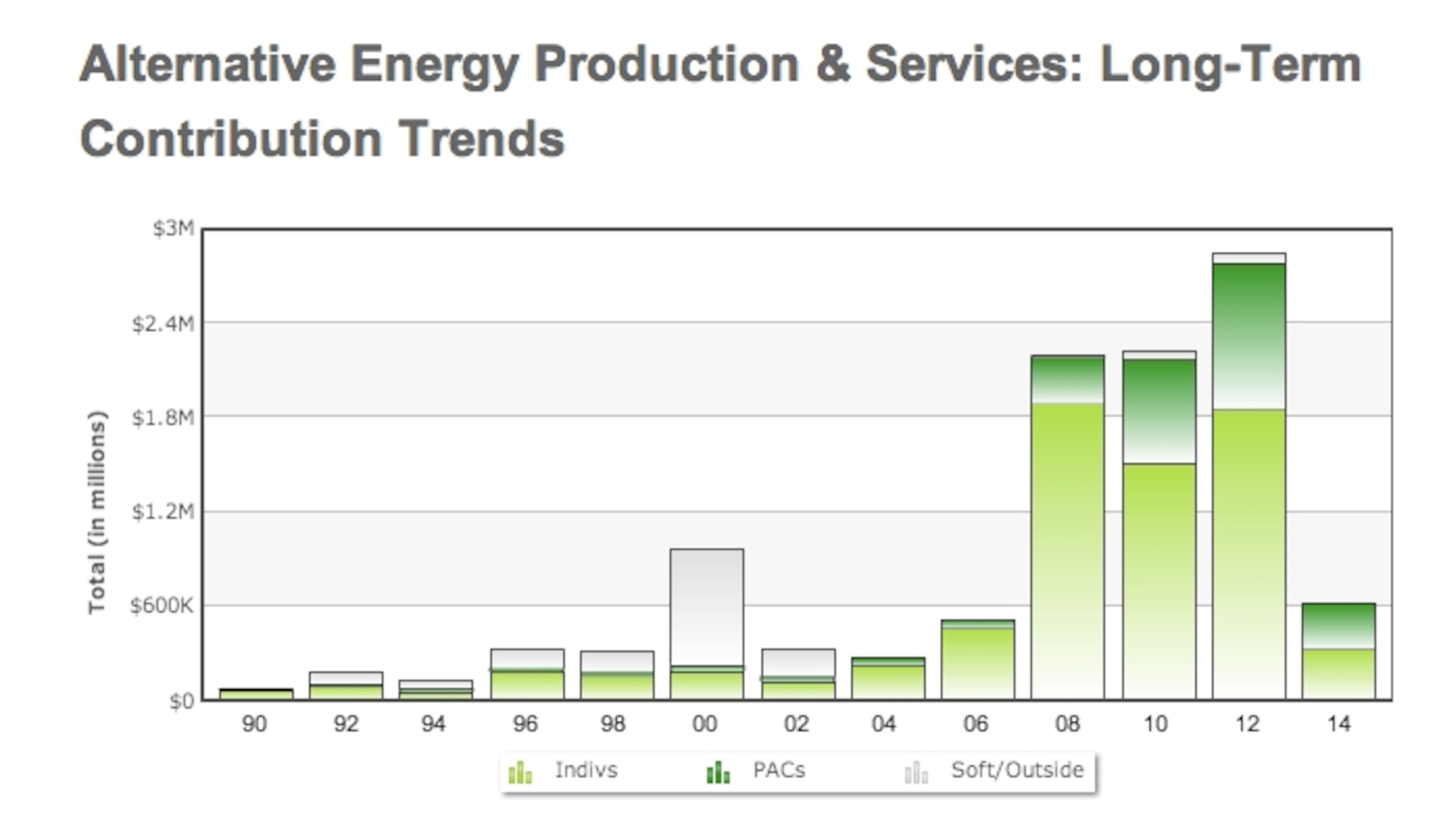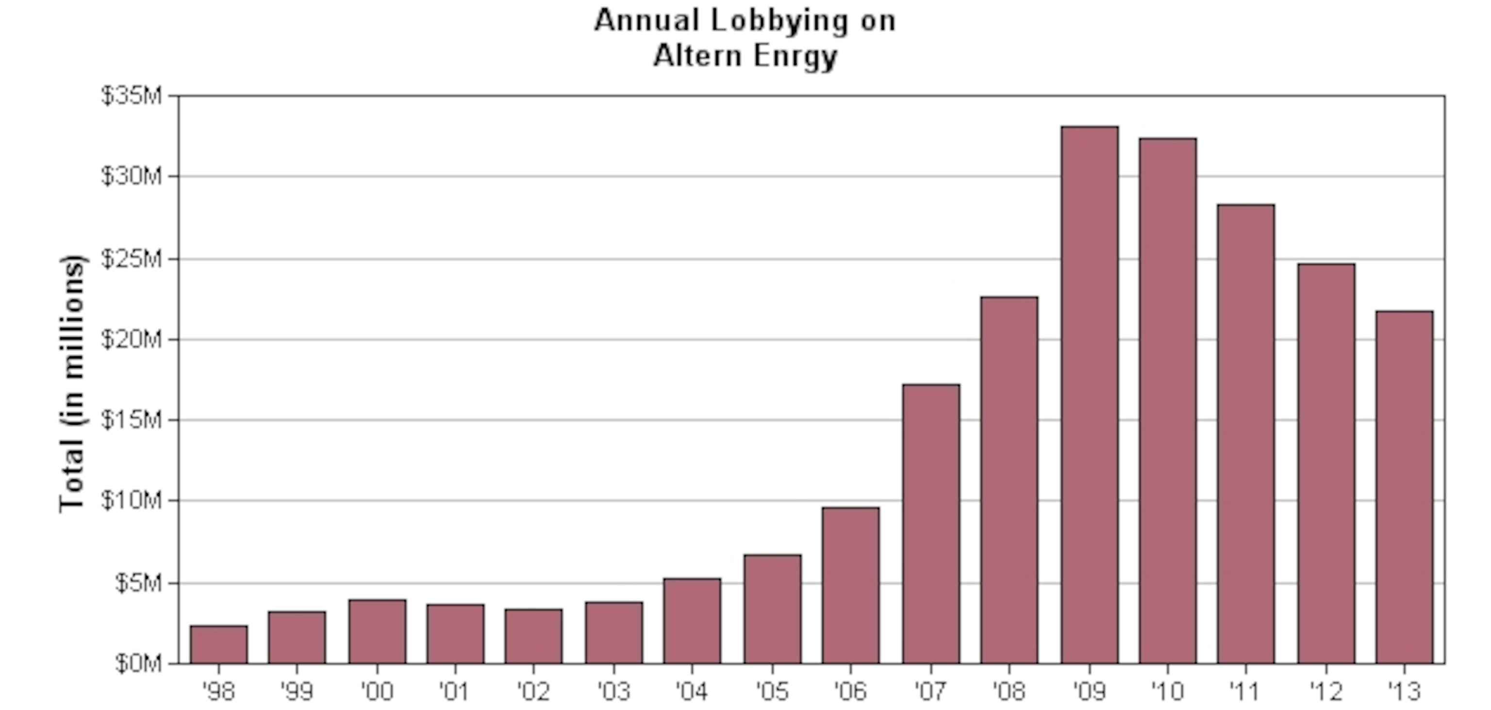 1 Keep in mind that alternative doesn’t necessarily mean renewable. Some of the money attributed to alternative energy looks a lot like fossil fuels. For example, Clean Energy Fuels Corp, owned by T. Boone Pickens, is one of the largest spenders in the OpenSecrets.org alternative energy sector. What is its business? Building infrastructure for natural gas-fueled cars.↩
