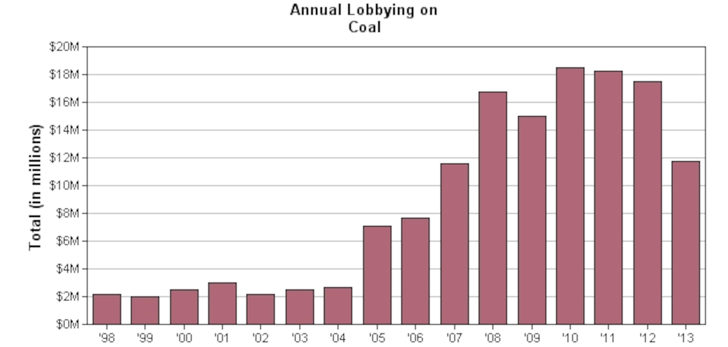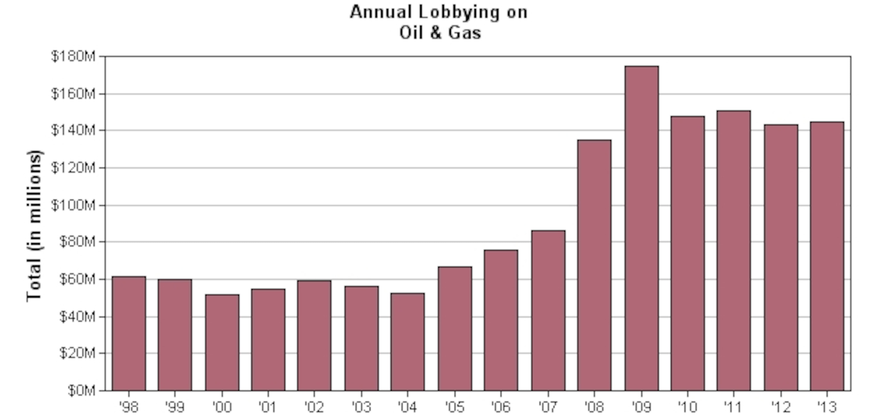 A reported 852 lobbyists worked for the fossil fuel industries. Three companies reported spending more than $10 million on their lobbying efforts: Exxon, Chevron, and Koch Industries.