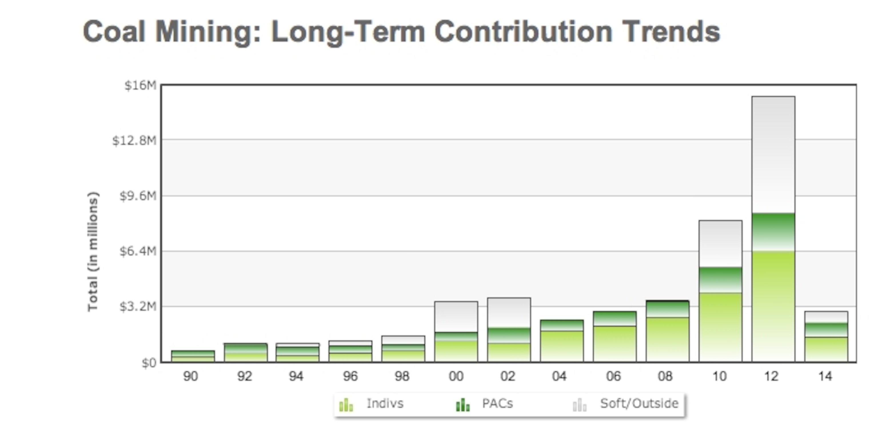 In the case of oil and gas and coal, note the huge spike in political contributions in the 2012 election cycle. They were at least two times higher than they had ever been before — leading to more than $40 million extra in the campaign coffers of by and large Republican candidates to influence the 2012 elections. What could have caused such a surge in campaign contributions? I would hazard that we are seeing the impact of the Citizens United decisionare seeing the impact of the Citizens United decisionare seeing the impact of the Citizens United decision on energy politics. Chalk one up for Republicans who choose to be friends of the fossil fuel industry.