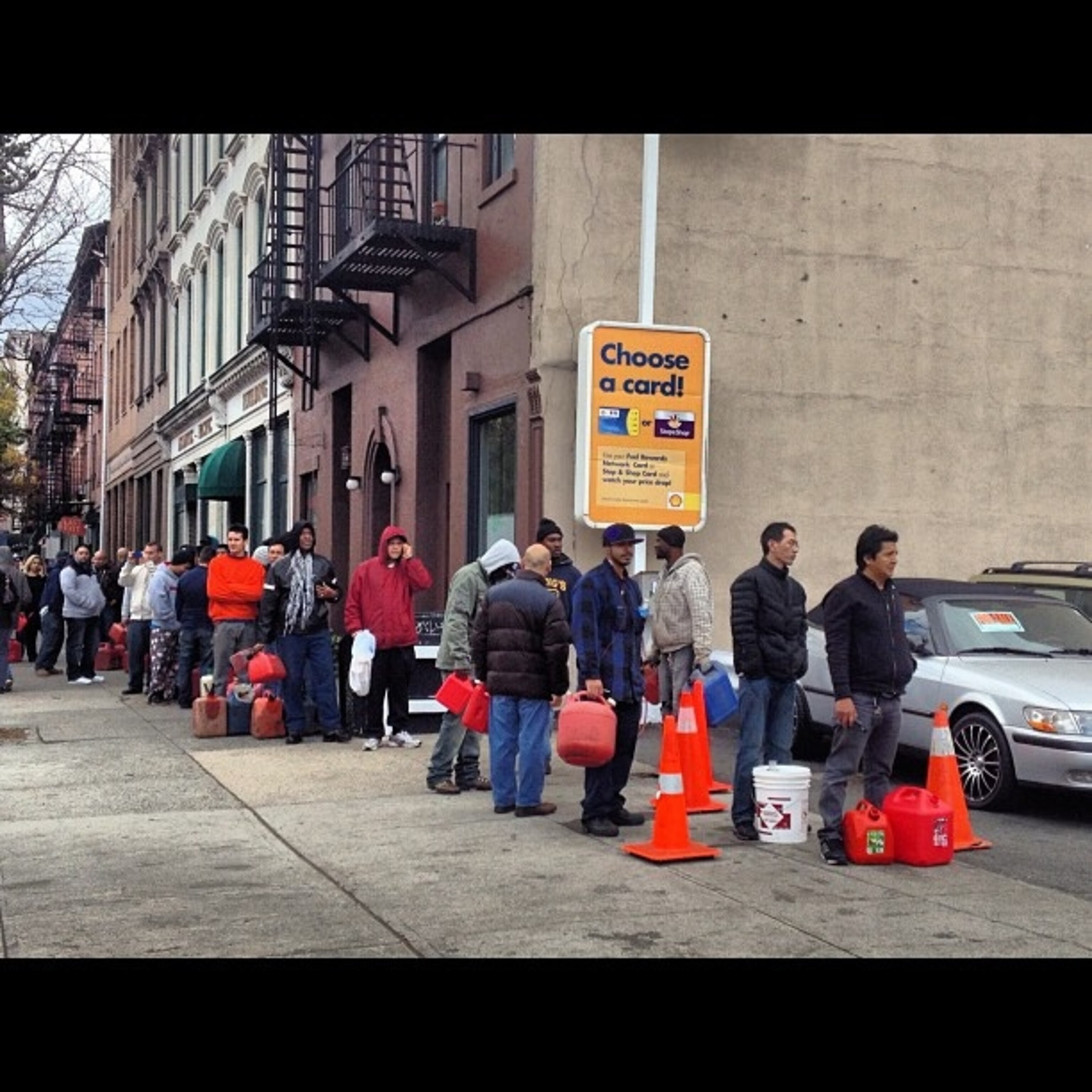 As Hurricane Sandy hit the U.S. Northeast, refineries and harbors were shut down, effectively disrupting nearly all fuel deliveries to the area. As a result gasoline stations have run out of petroleum and shut down, and those that remain open see customers lining up for hours to get to the pump.