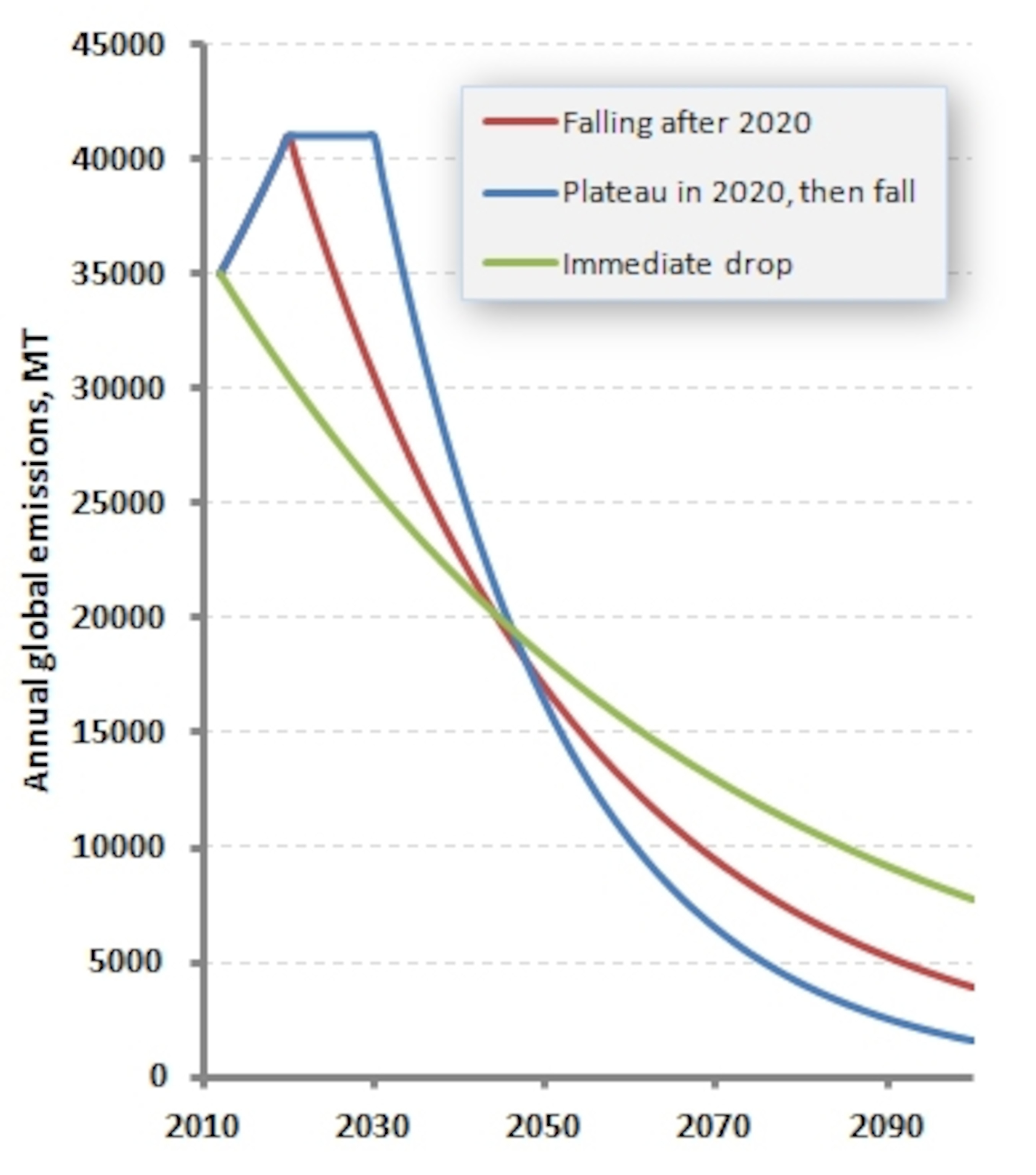 3. Business as usual continues until 2020, but the “Durban Platform” acts aggressively on global emissions post-2020, with emissions peaking in that year and then falling. To achieve the same outcome as Case 2 the annual rate of decline must now be 3% p.a.